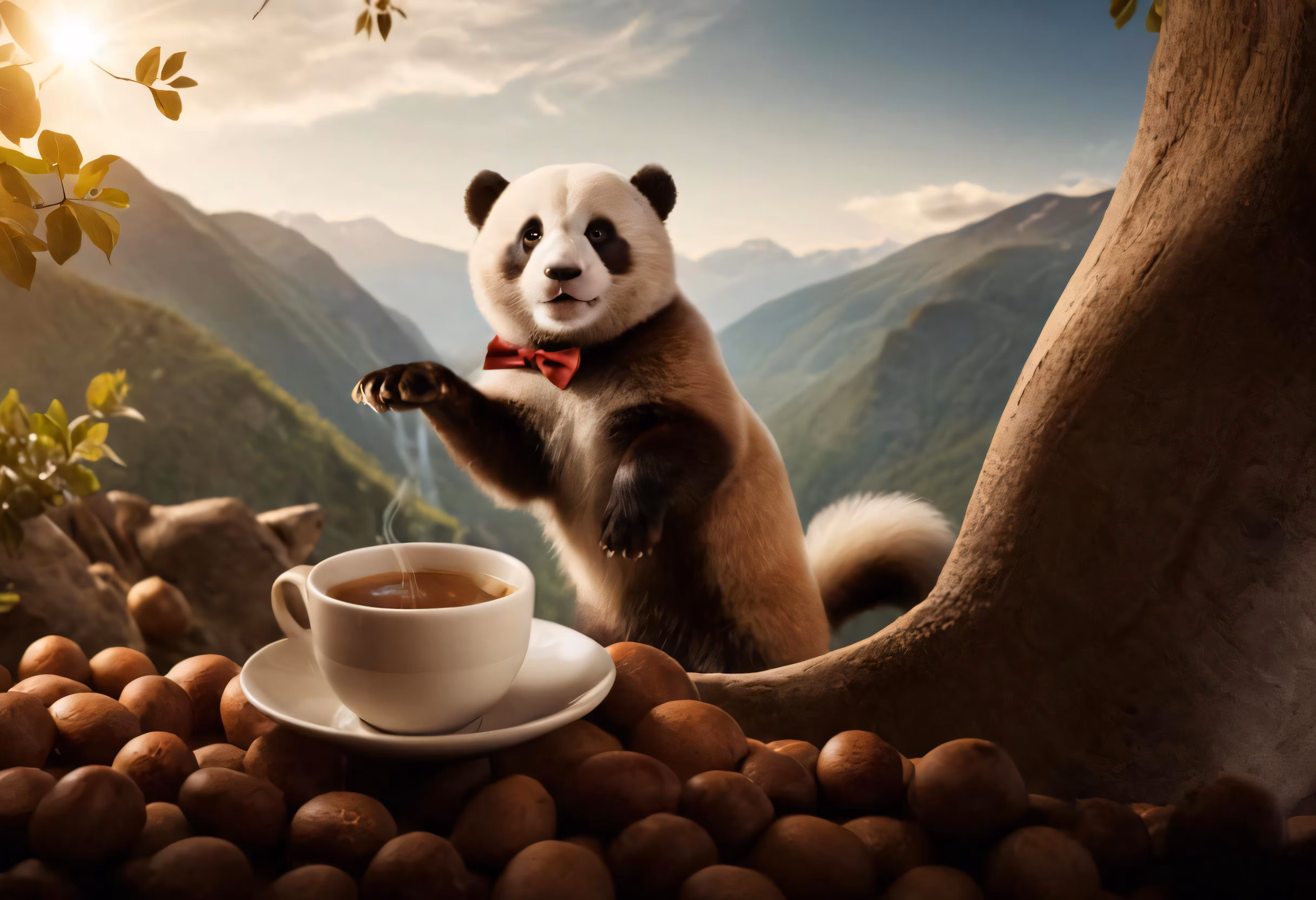 High resolution picture, free to use, a panda standing up on rocks next to a cup of tea