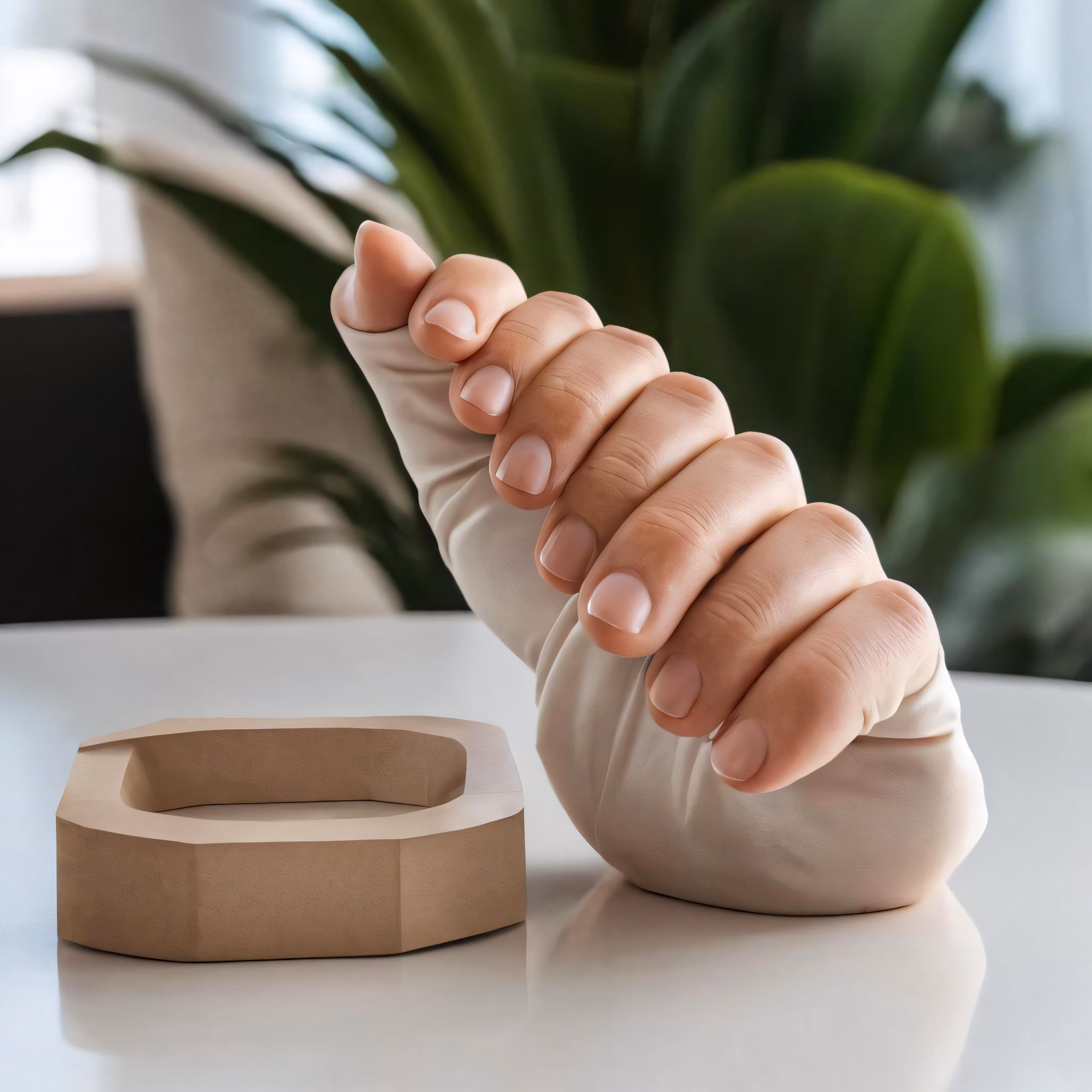 High resolution picture, free to use, a person holds their hand up to a fake object