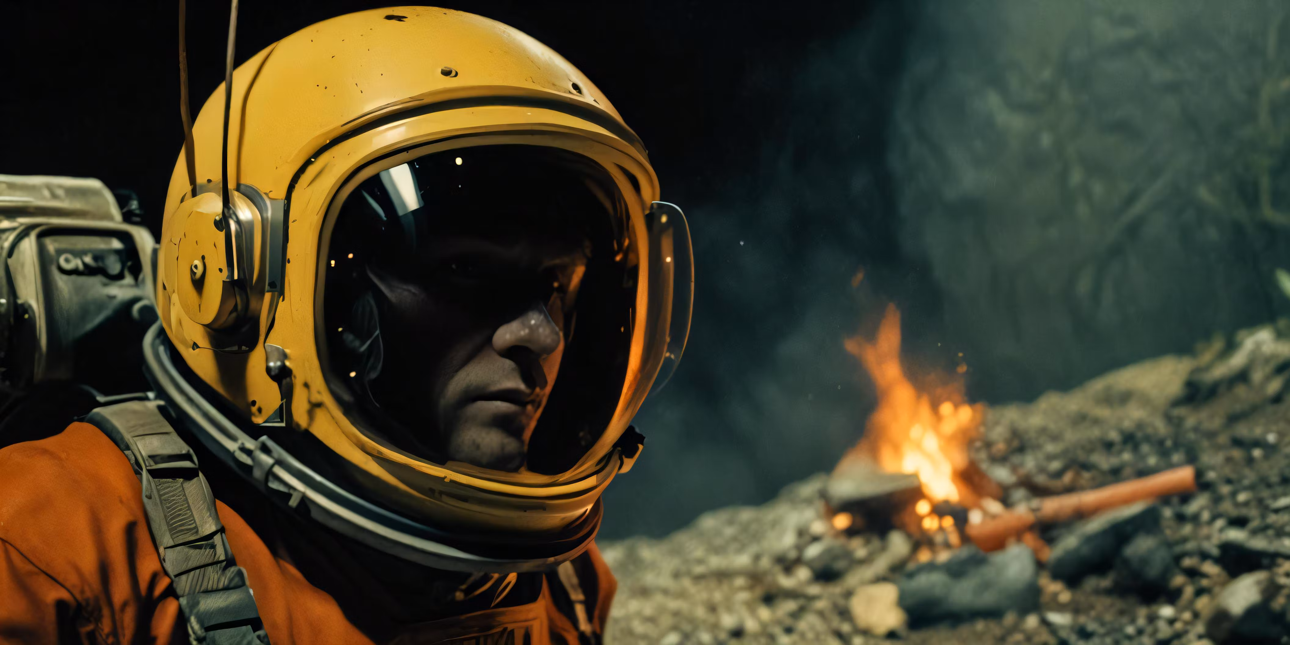 High resolution picture, free to use, a person in a helmet and jacket in front of a fire