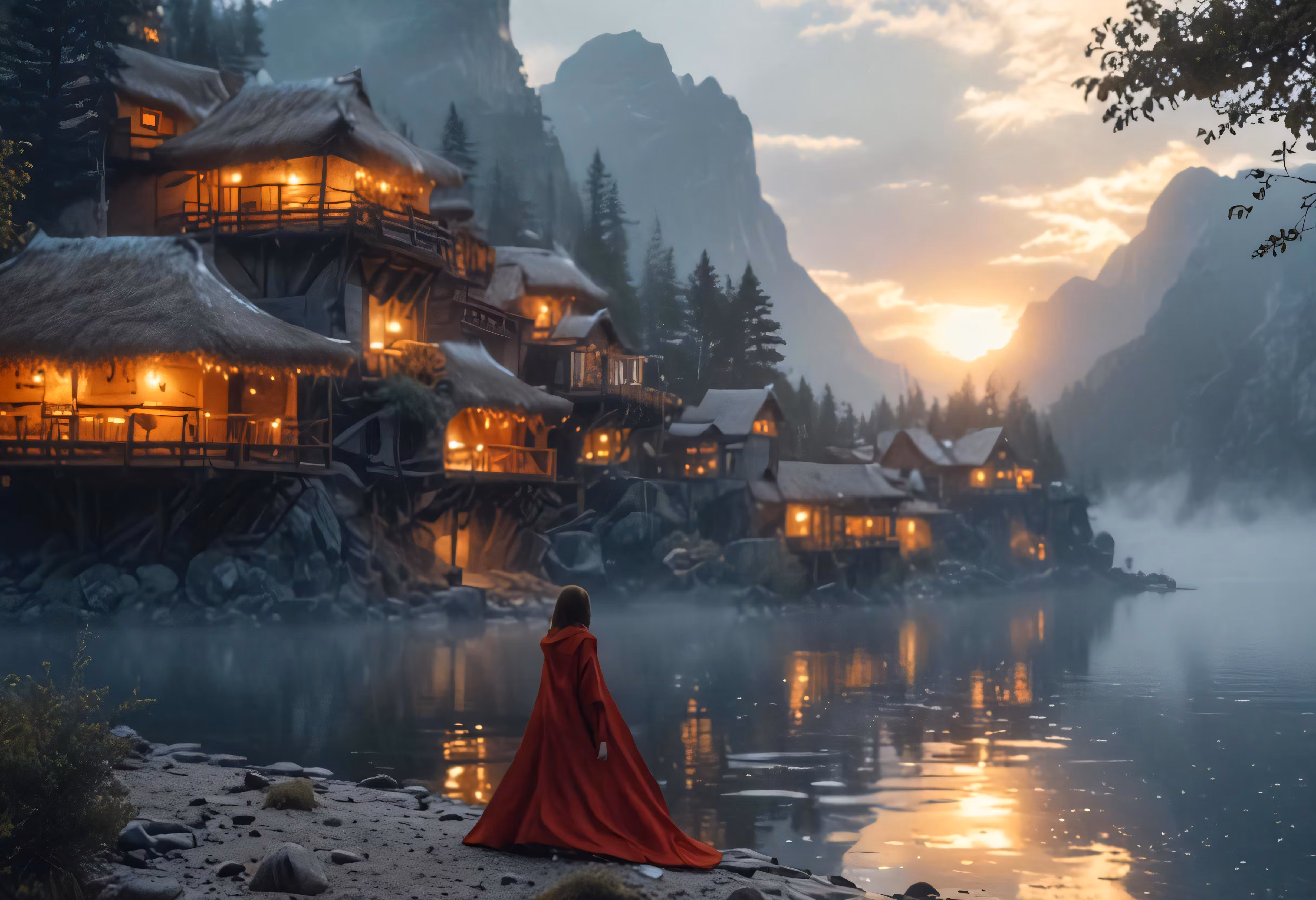 High resolution picture, free to use, a person in red dress walking away from a lake at dusk