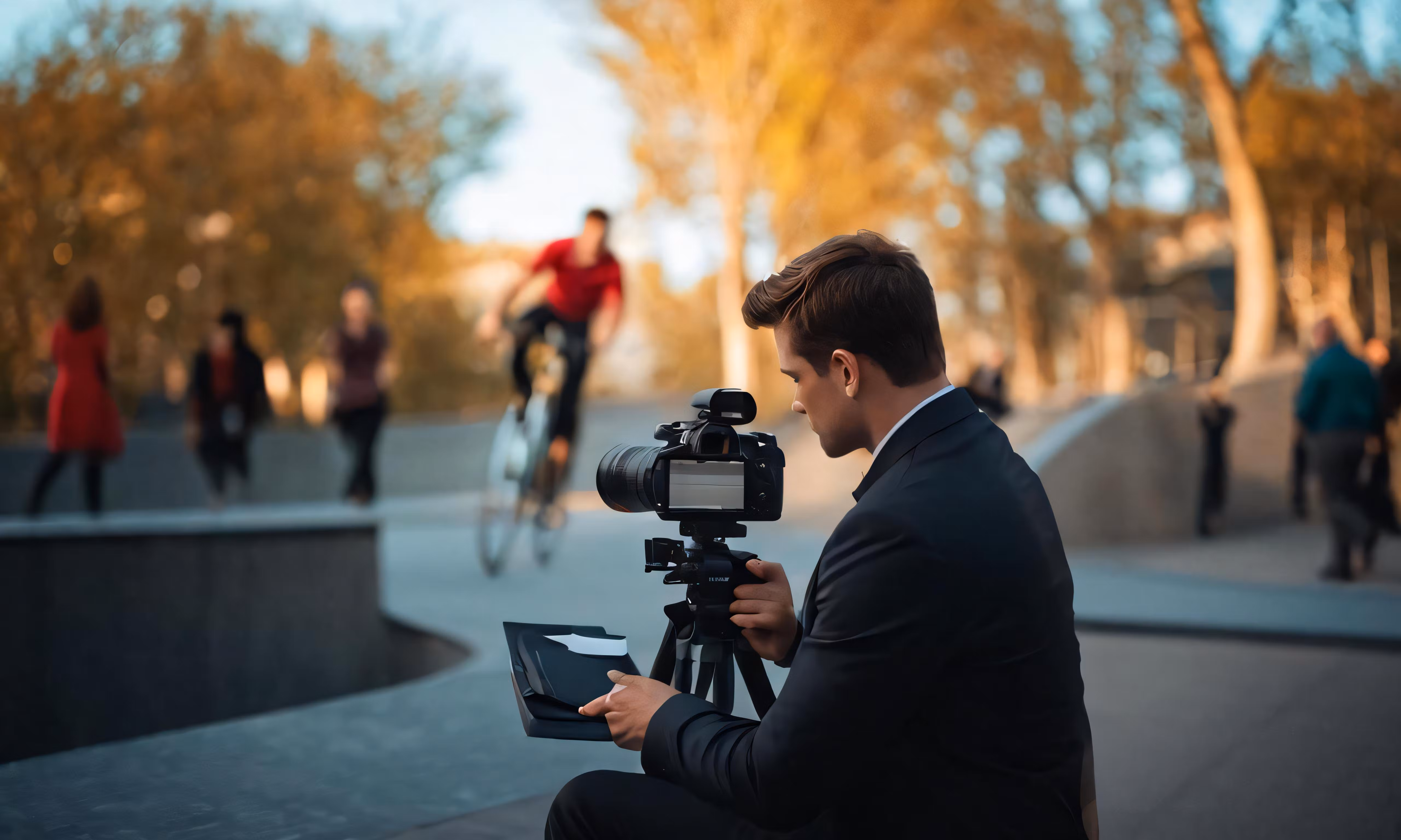 High resolution picture, free to use, a person is filming a bicyclist while someone on a bike rides in the background