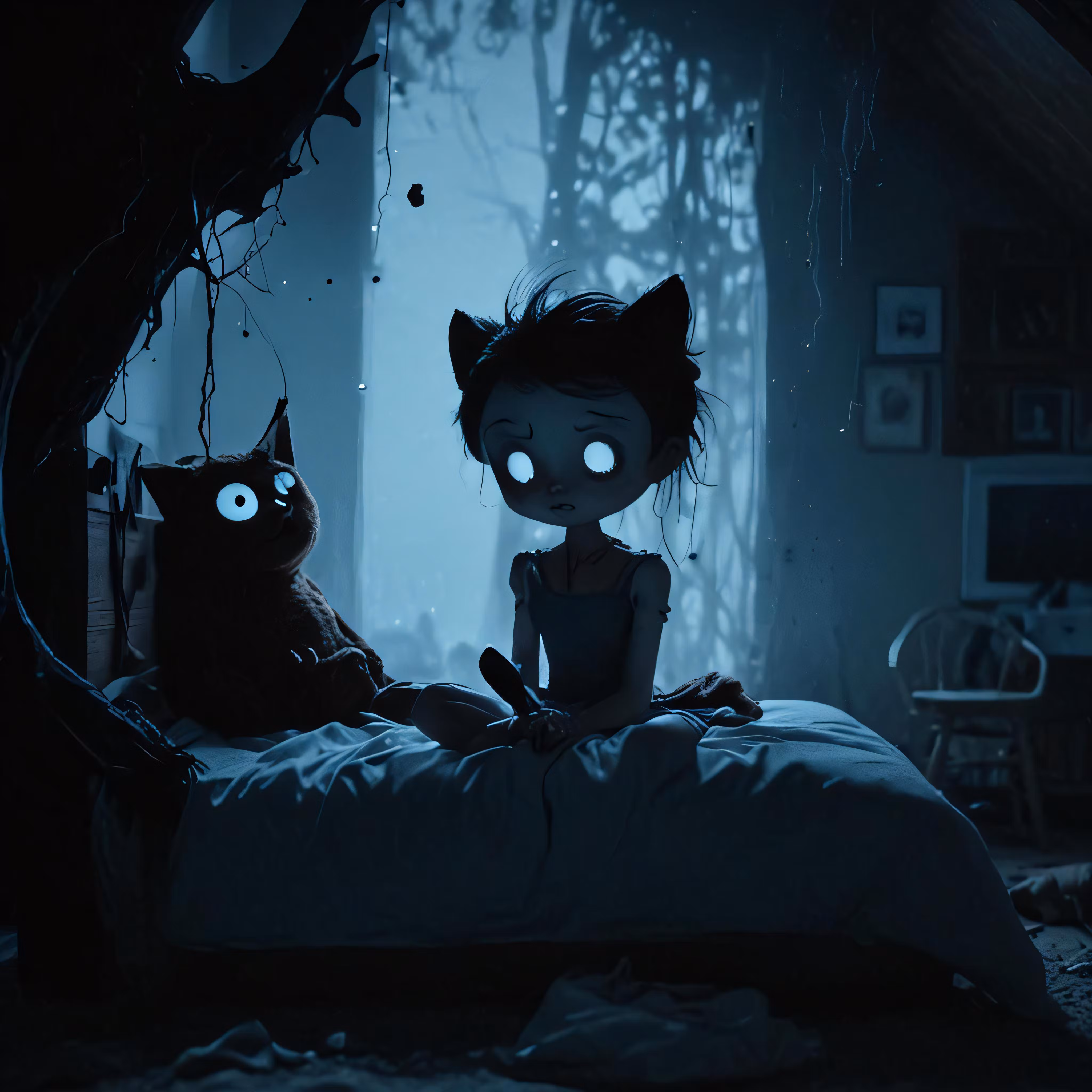 High resolution picture, free to use, a person sits in bed with an evil looking cat
