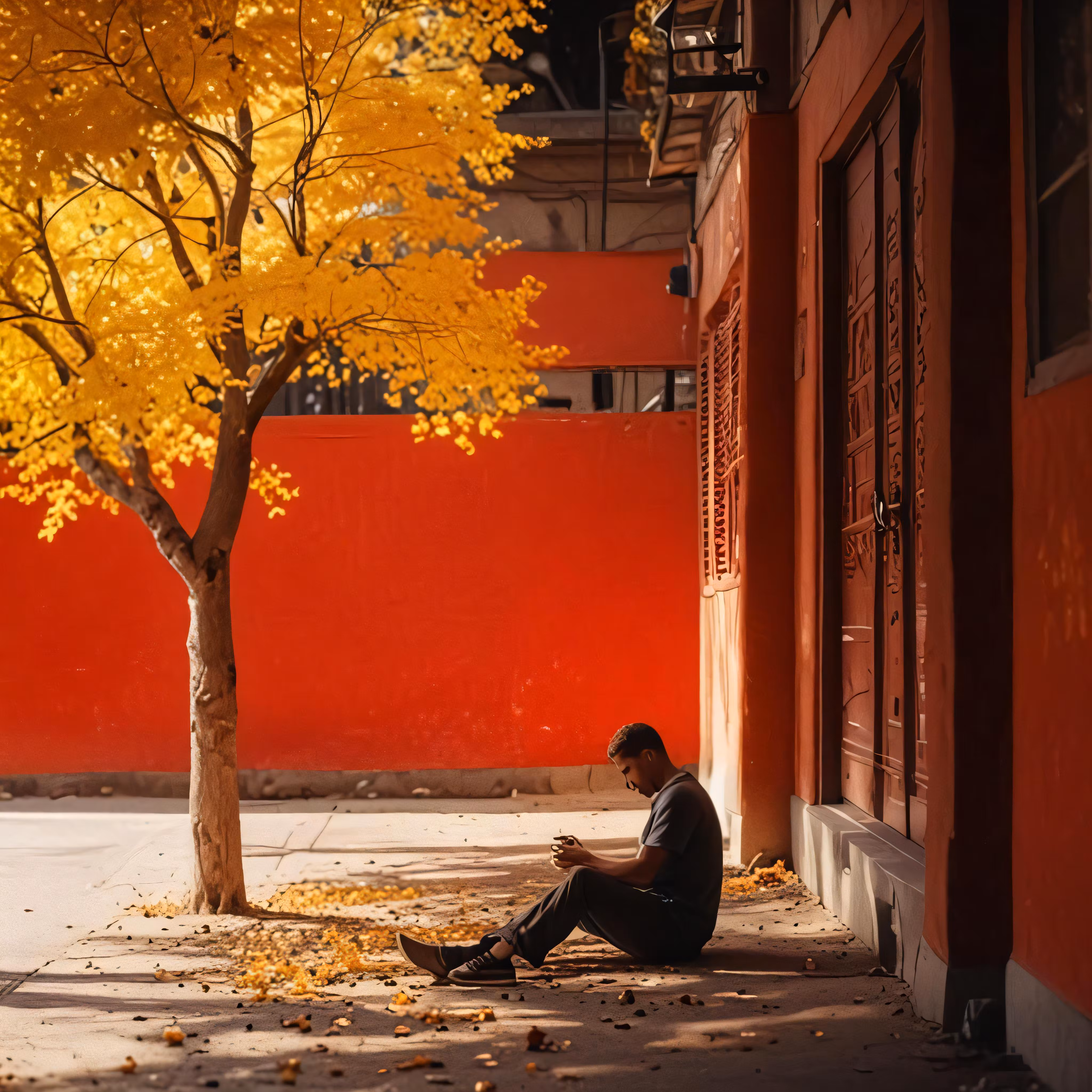 High resolution picture, free to use, a person sits on the ground with leaves