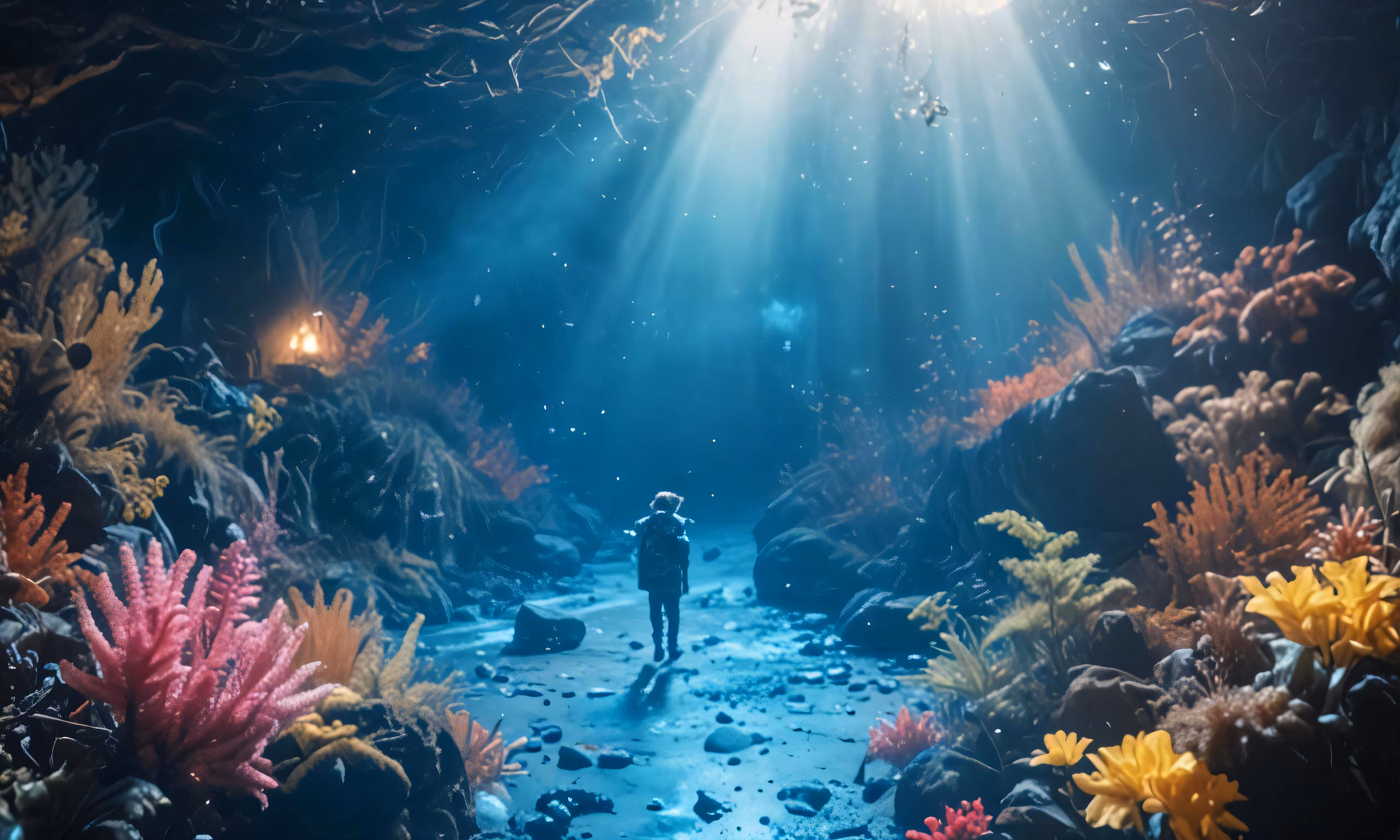 High resolution picture, free to use, a person standing in the middle of a room covered with fish