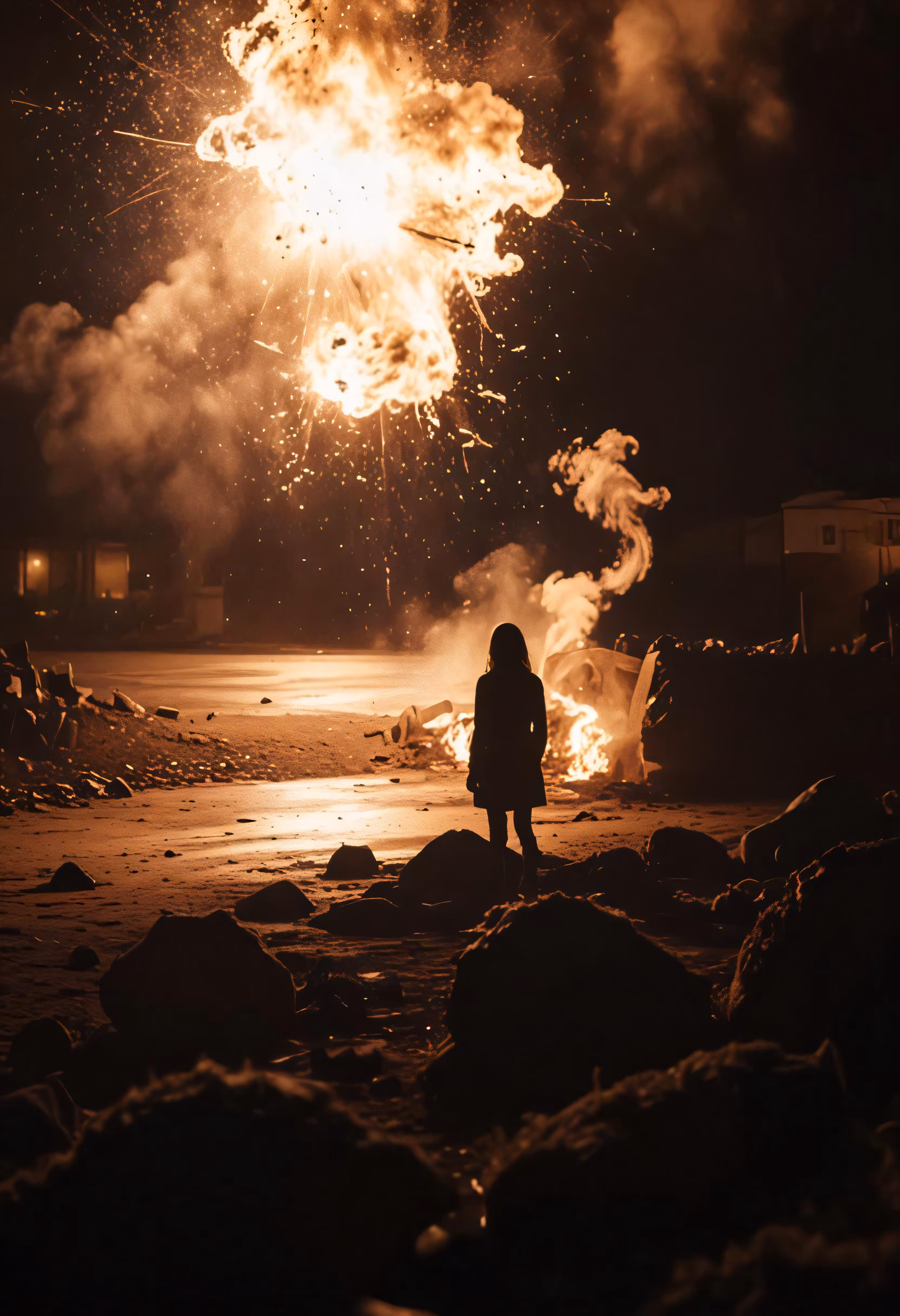 High resolution picture, free to use, a person standing next to a fireball on top of a street