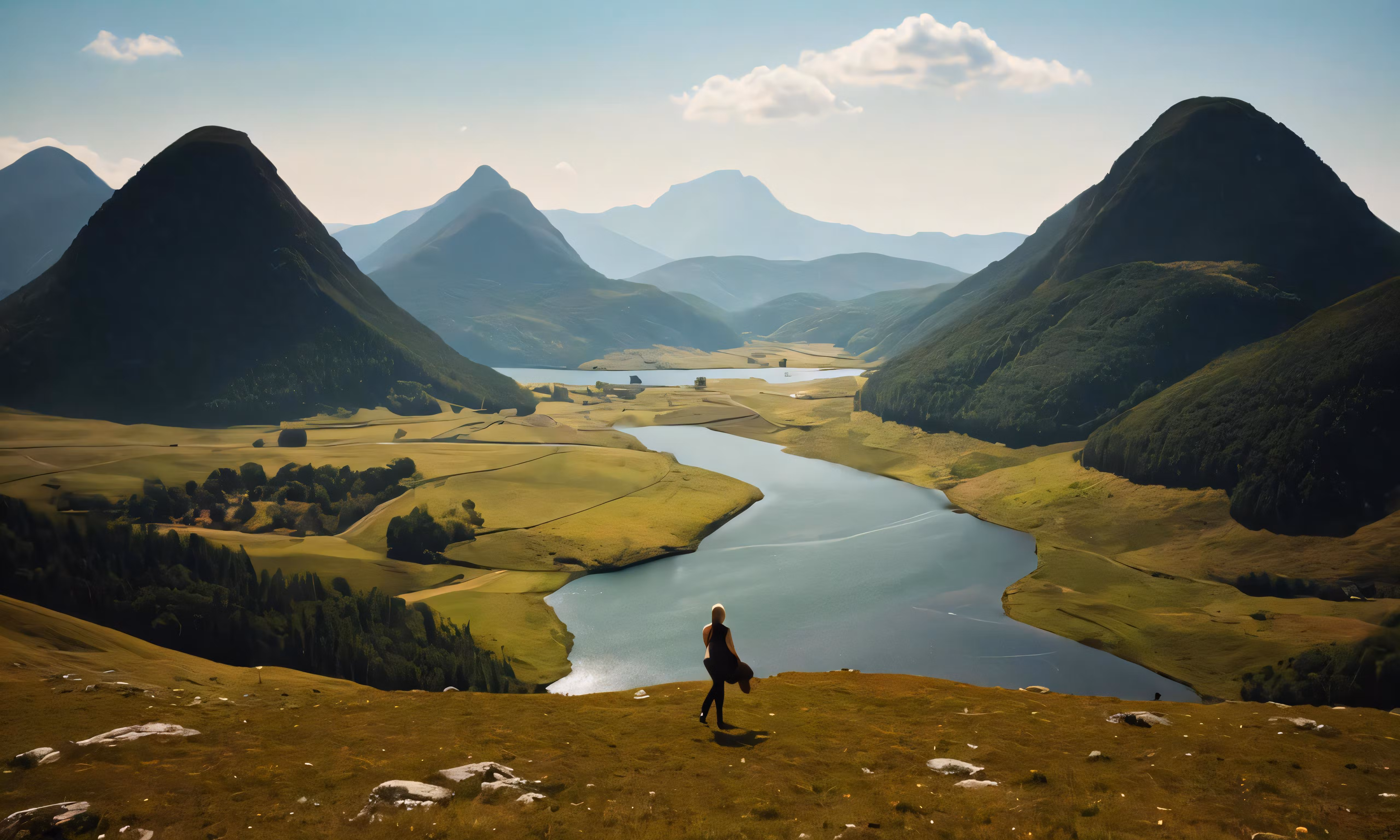 High resolution picture, free to use, a person standing on the edge of a cliff overlooking a lake