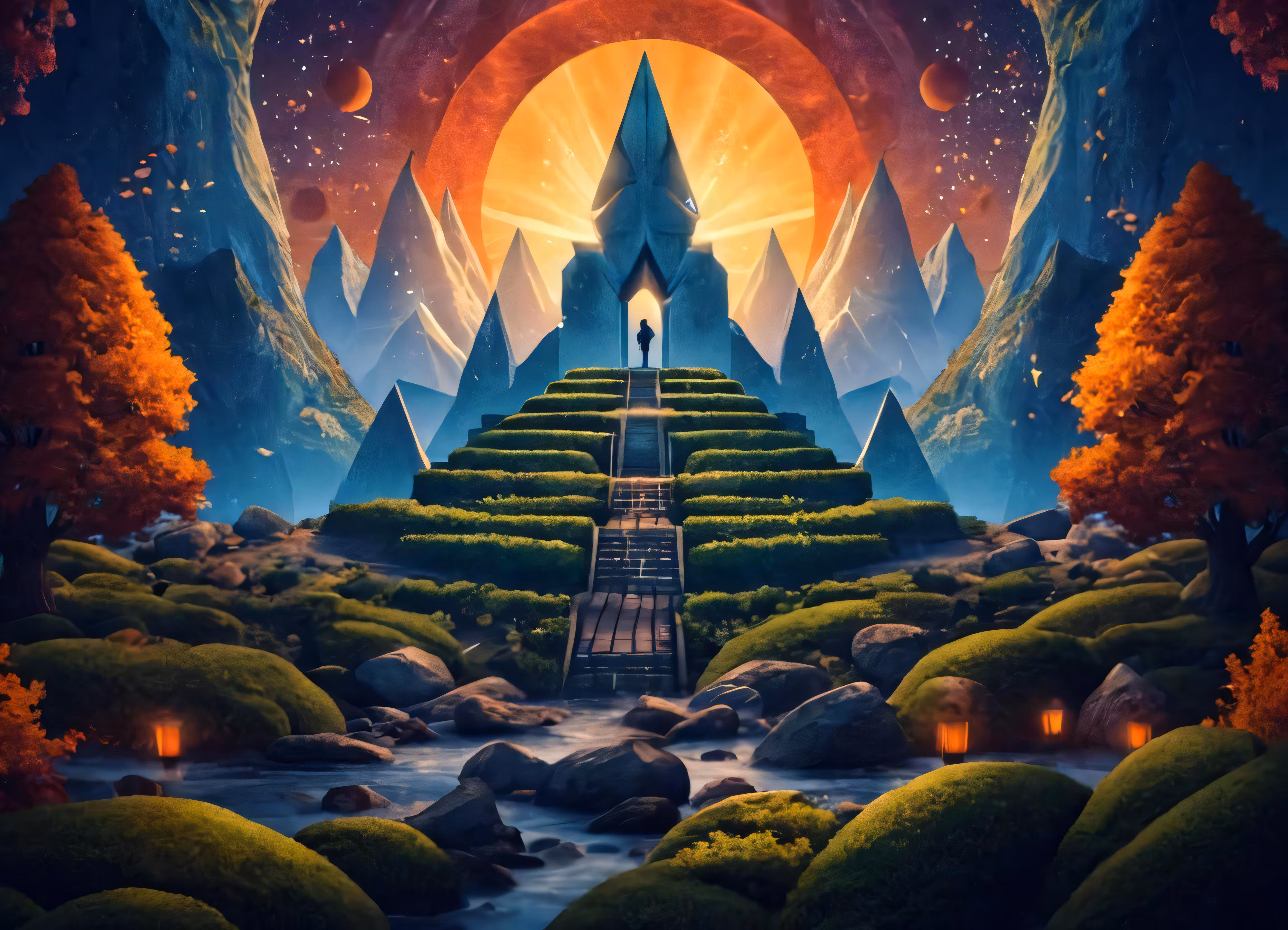 High resolution picture, free to use, a person standing on top of a pyramid overlooking a river