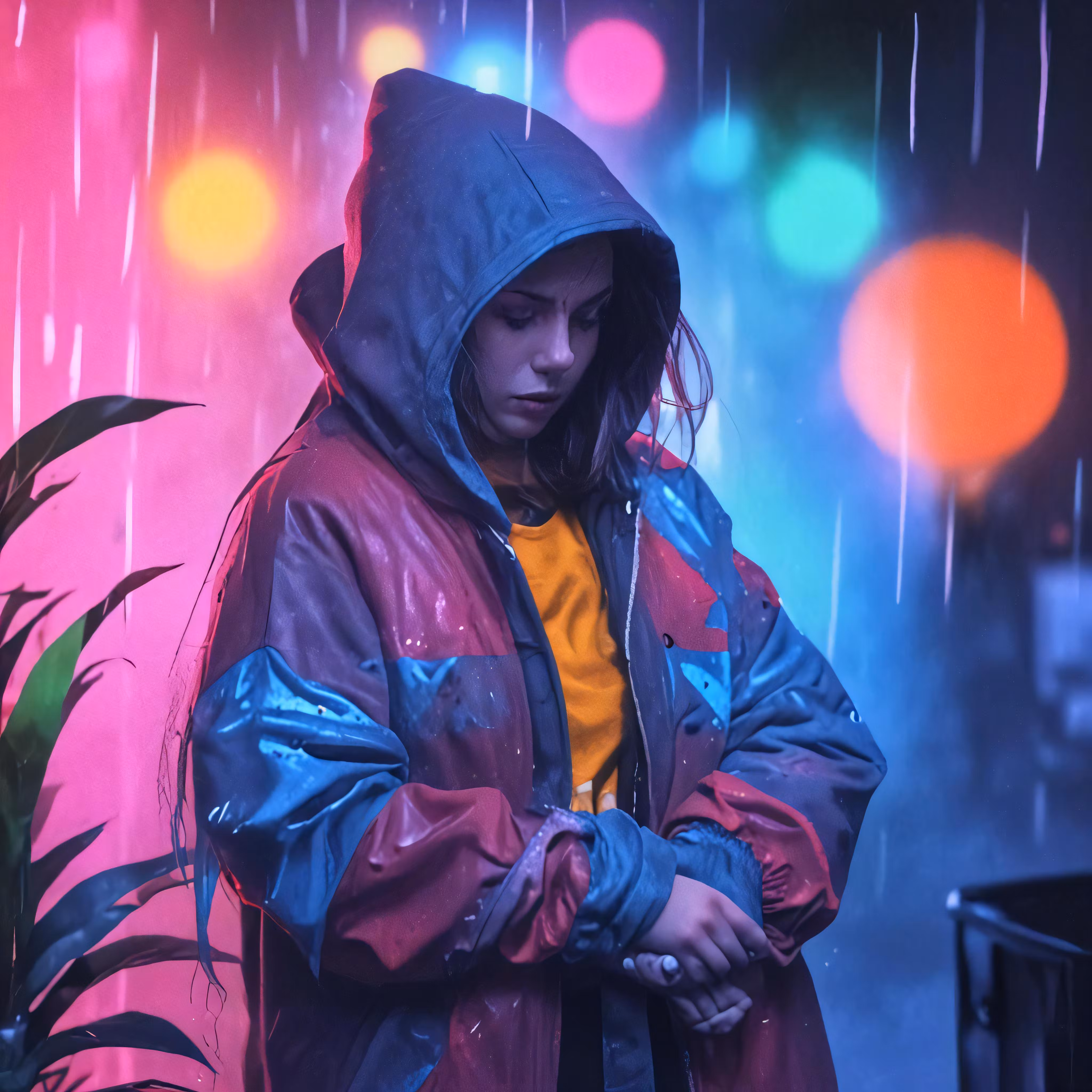 High resolution picture, free to use, a person standing outside under a rain filled street lamp