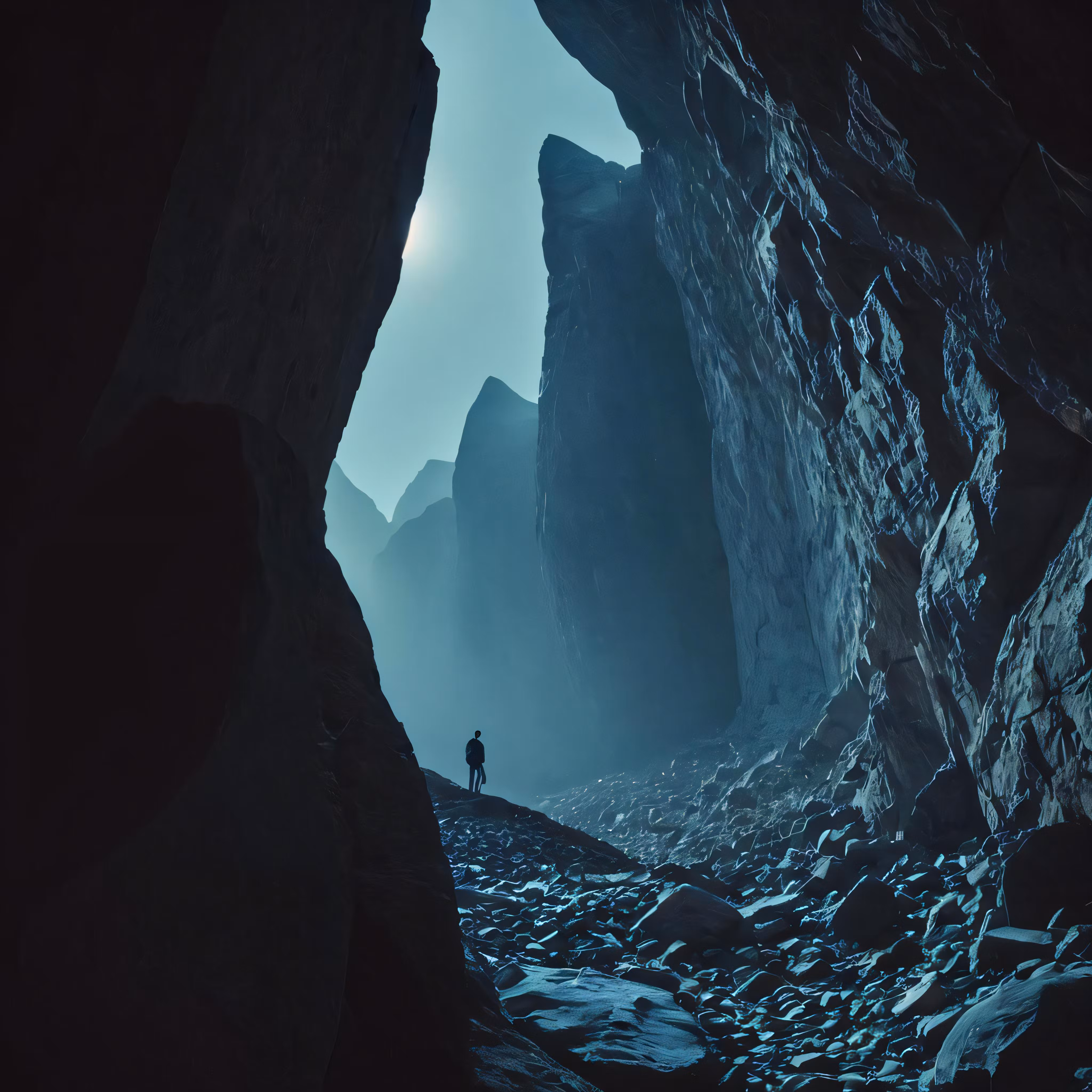 High resolution picture, free to use, a person stands between two large rocks in a cave