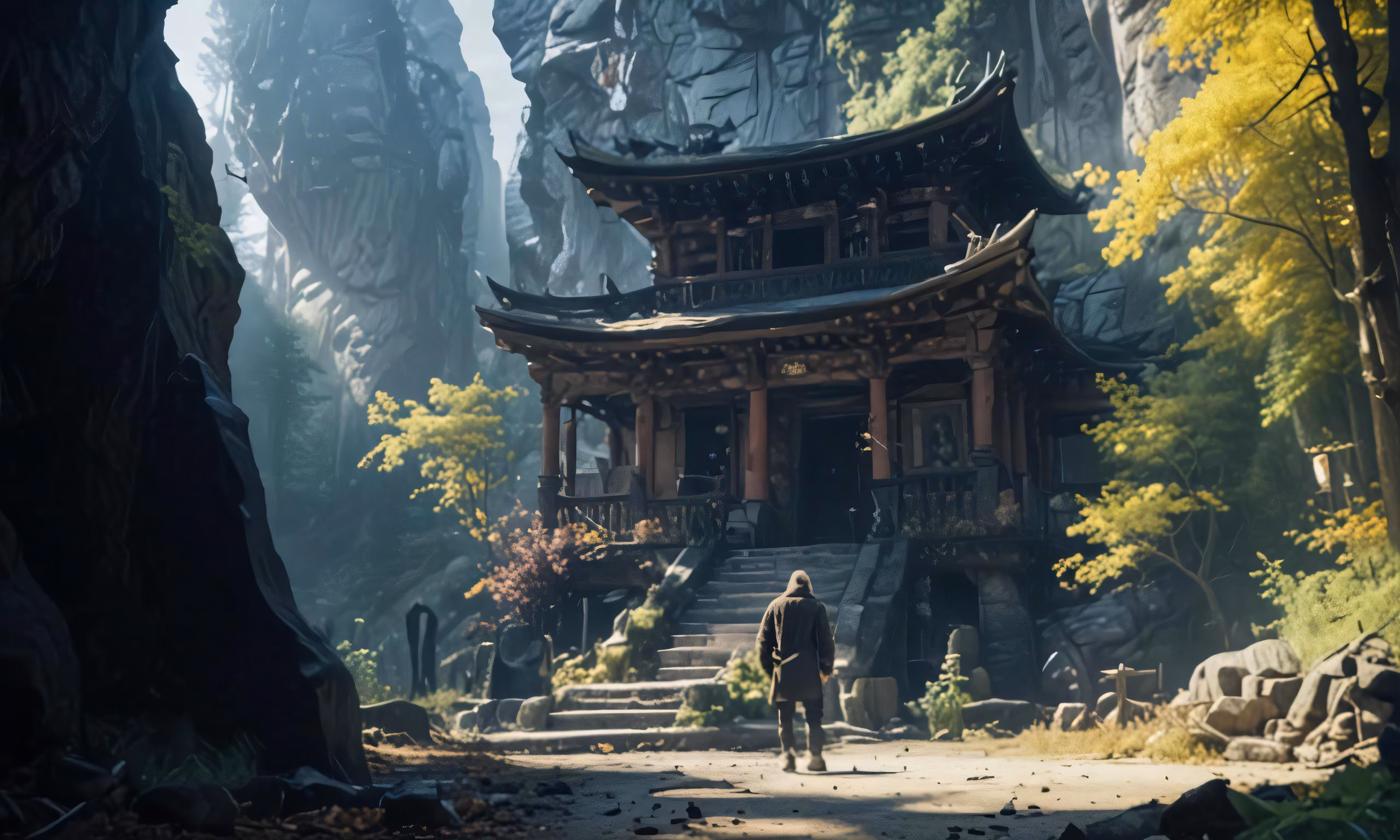 High resolution picture, free to use, a person stands in front of an oriental style building