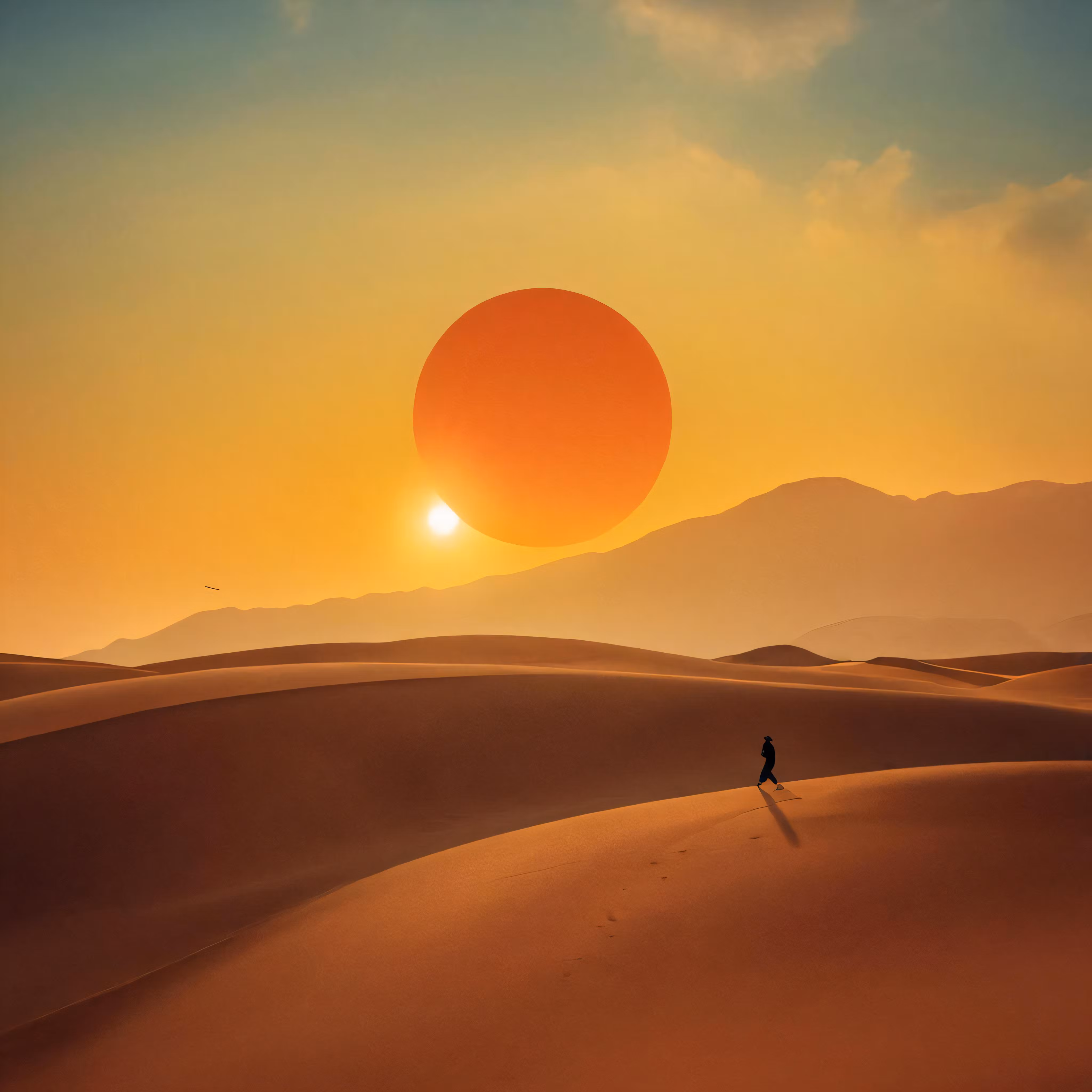 High resolution picture, free to use, a person walking down a sandy hill with the sun setting