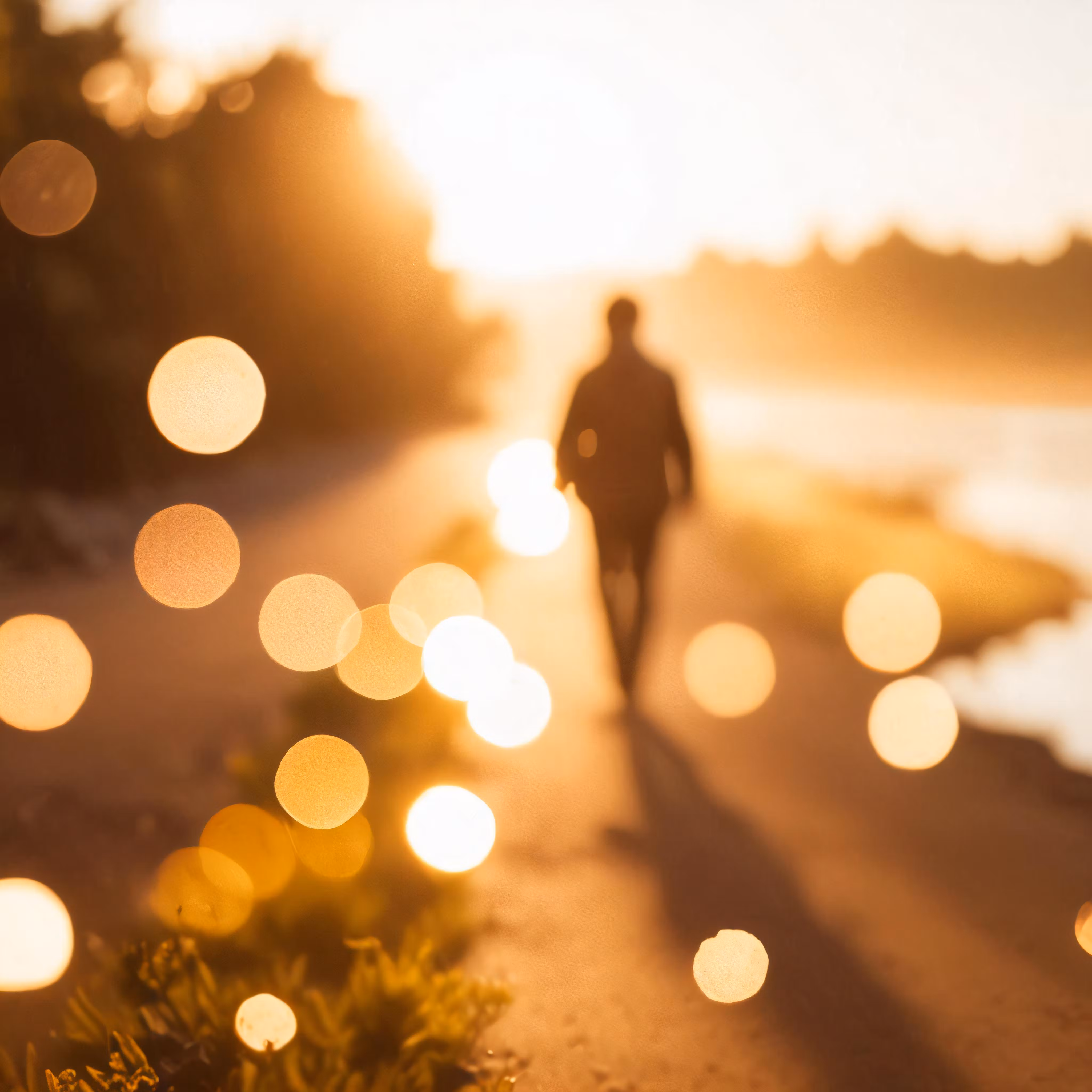 High resolution picture, free to use, a person walking down the road with sun setting behind them