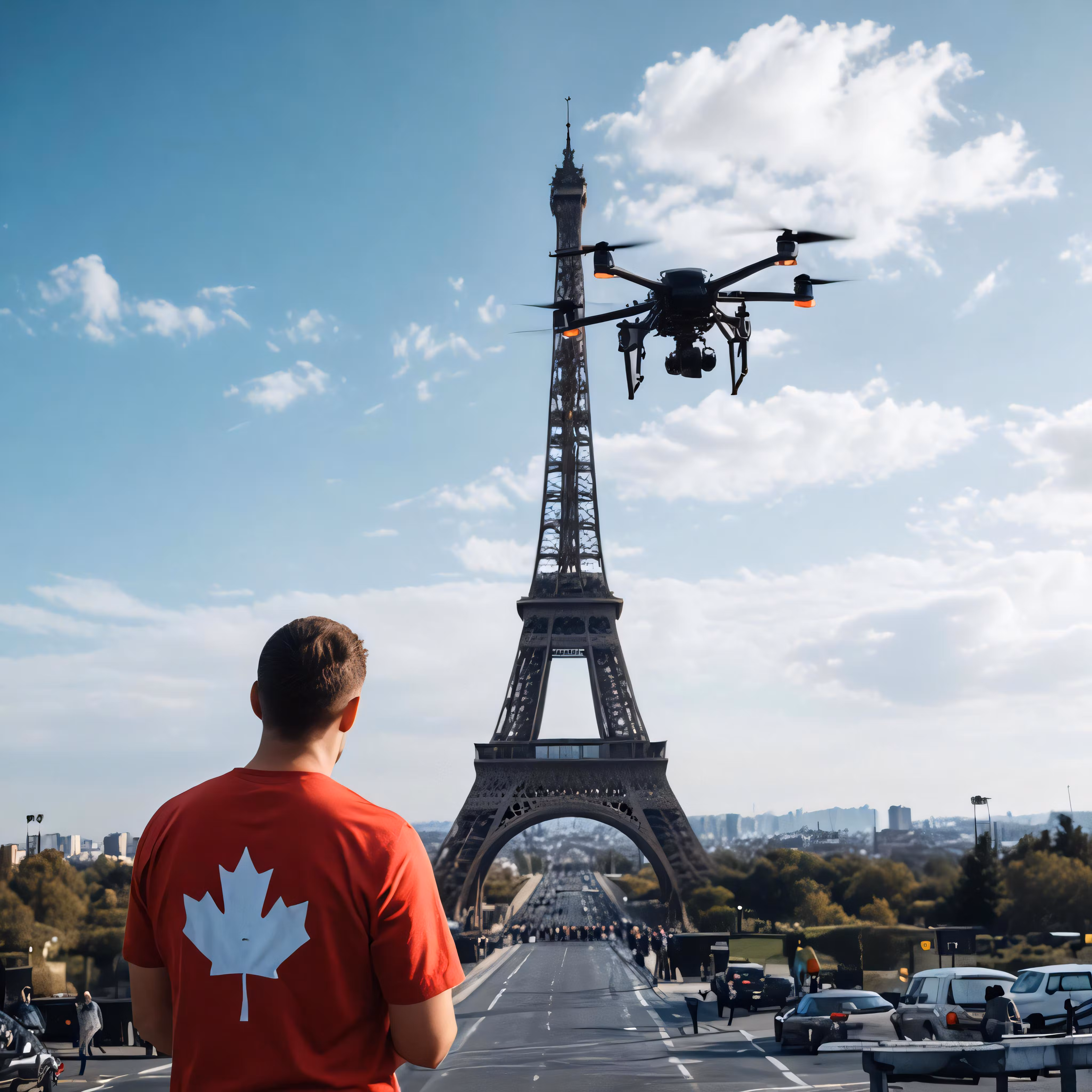 High resolution picture, free to use, a person watches as a djoope prepares to land on top of the eiffel tower