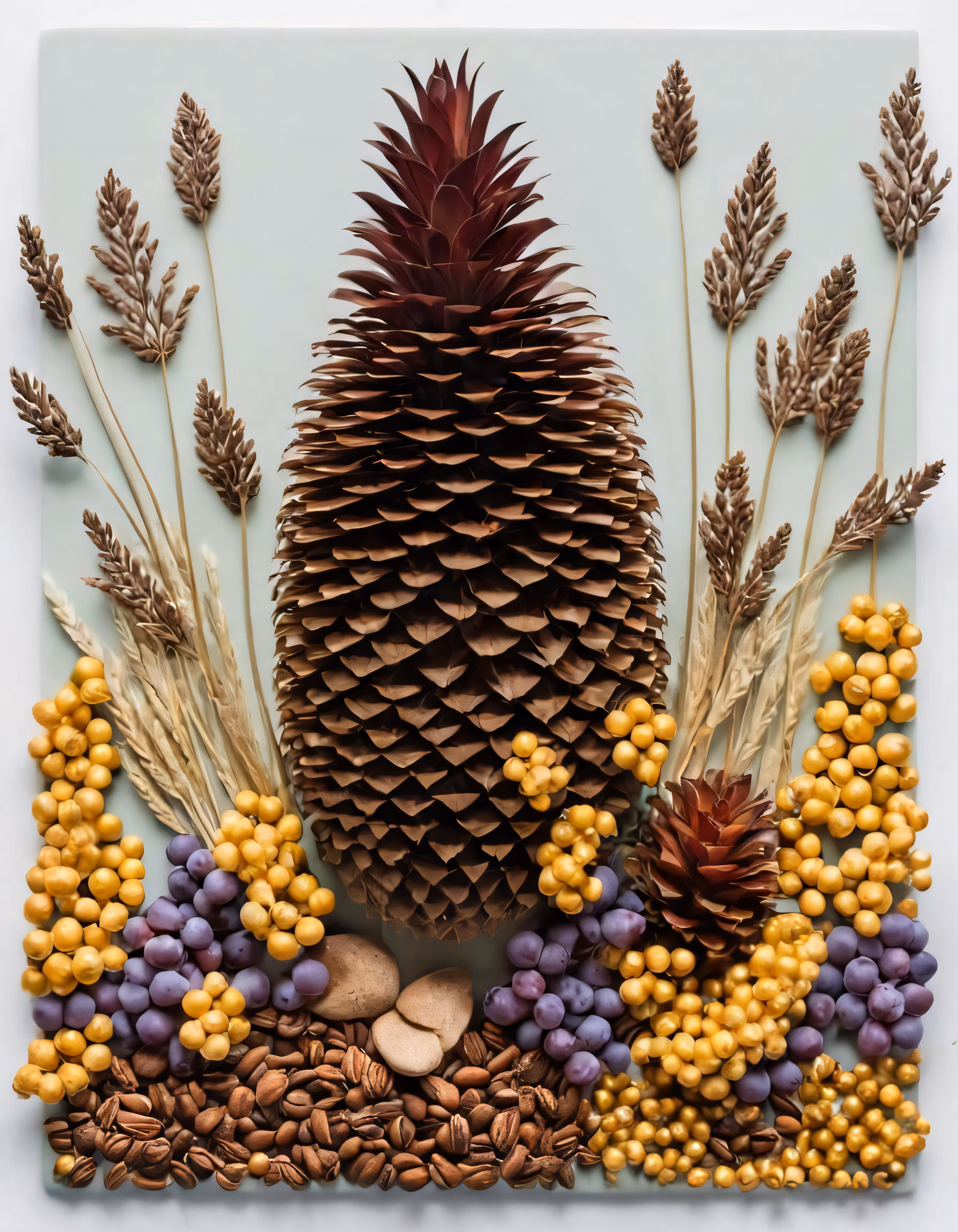 High resolution picture, free to use, a photo is made out of various objects, including nuts and plants