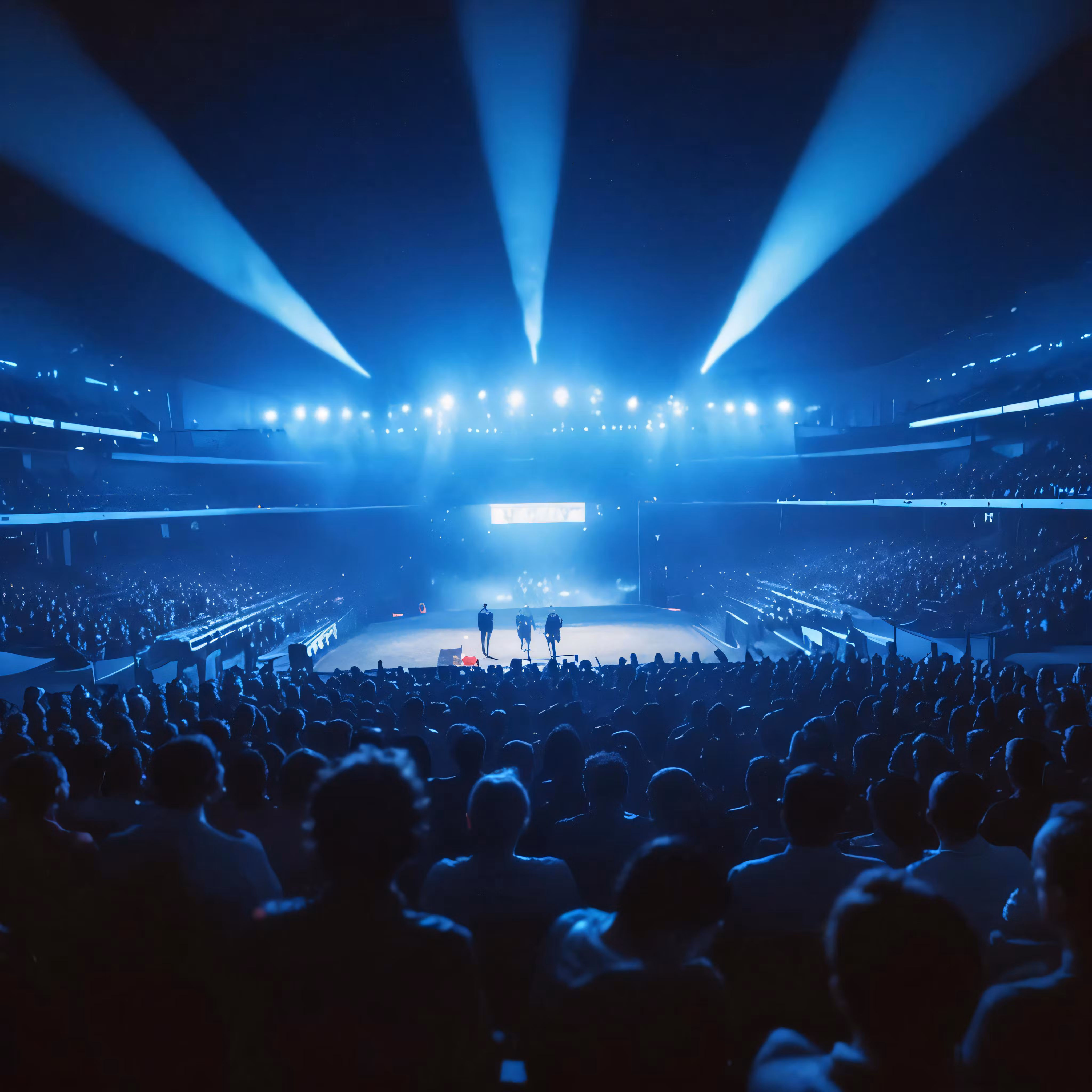High resolution picture, free to use, a photo taken from the stage in the middle of an arena at a concert with lights streaming down