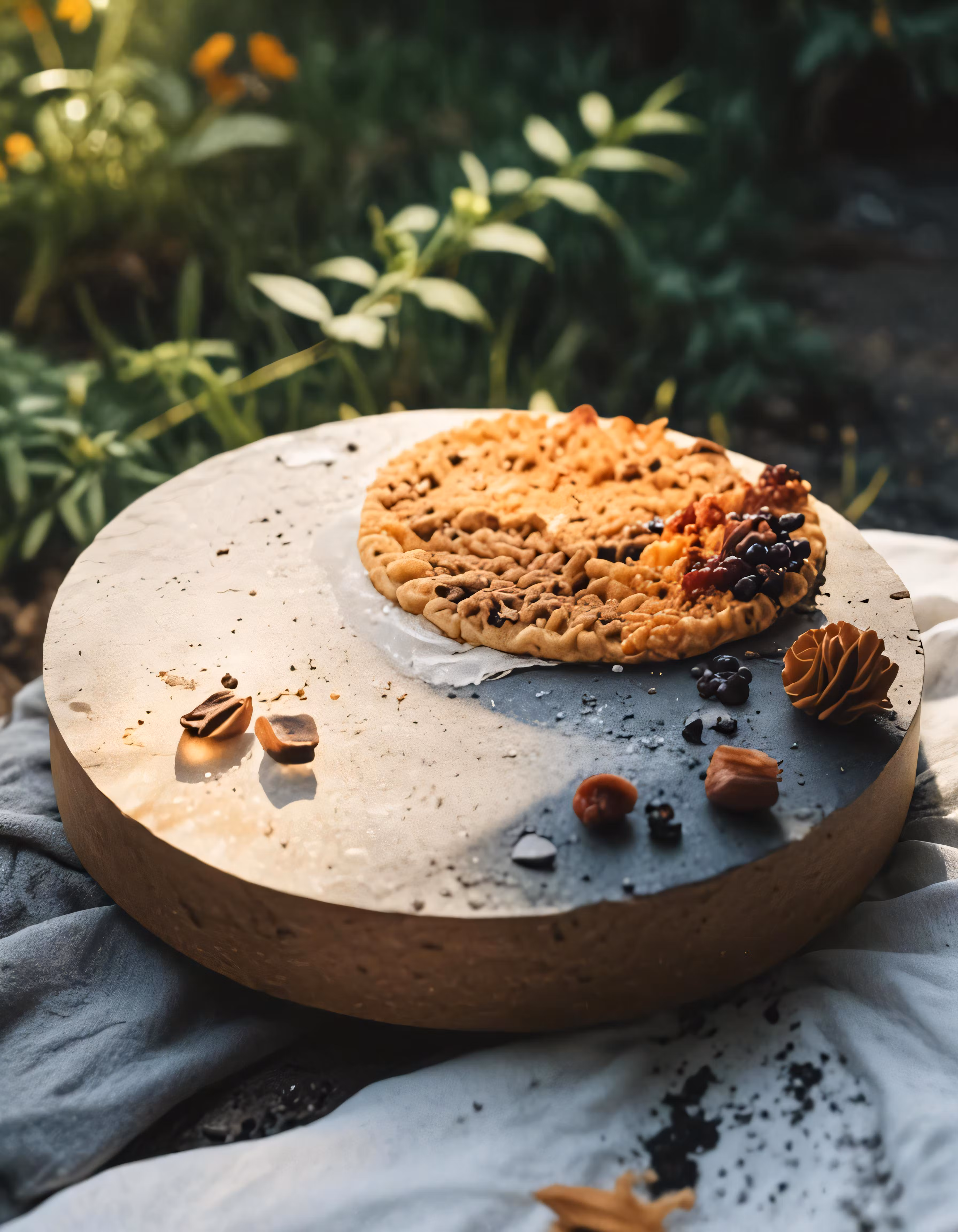 High resolution picture, free to use, a pie with nuts, berries and pecans sitting on a wooden table