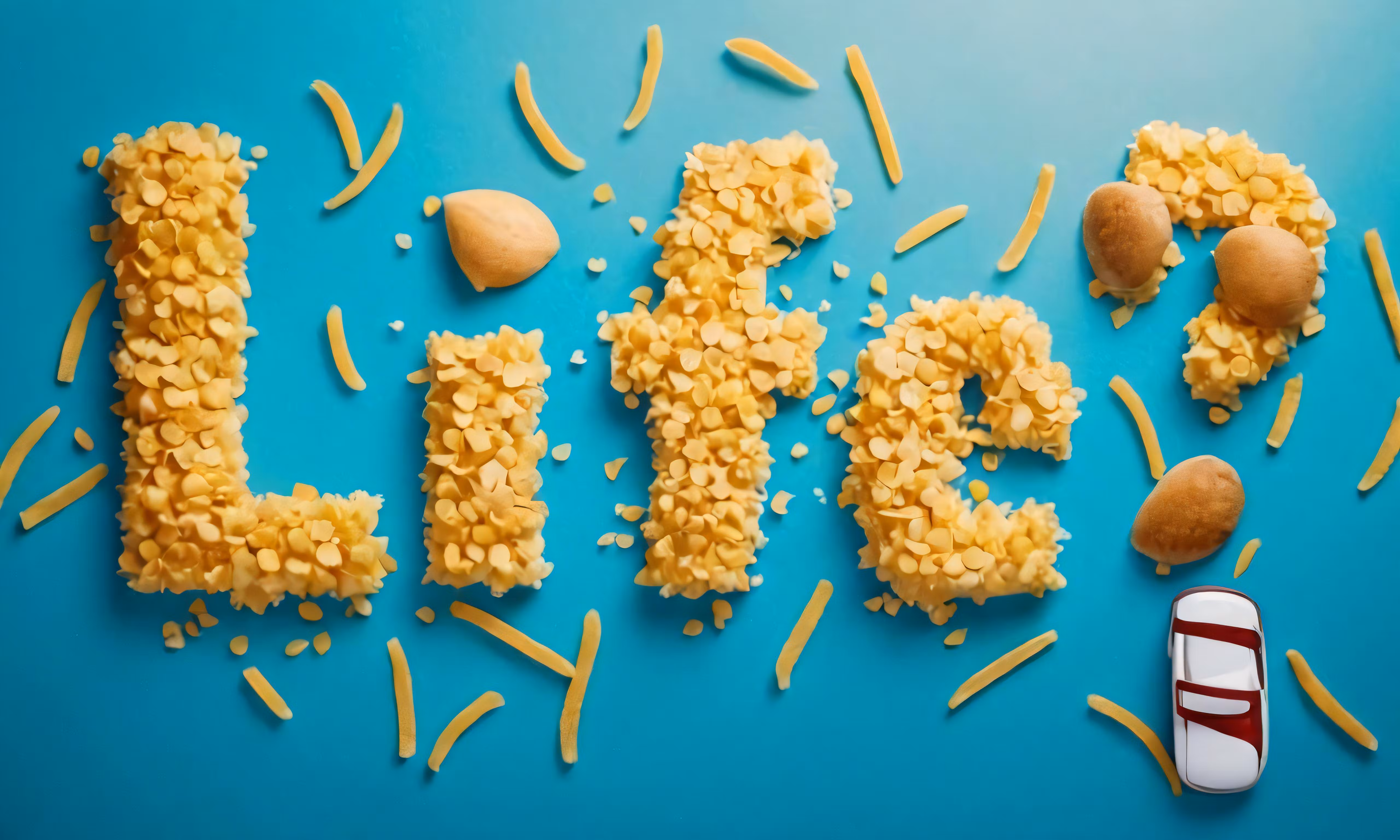 High resolution picture, free to use, a piece of cake, bagel chips and letters spelling out food