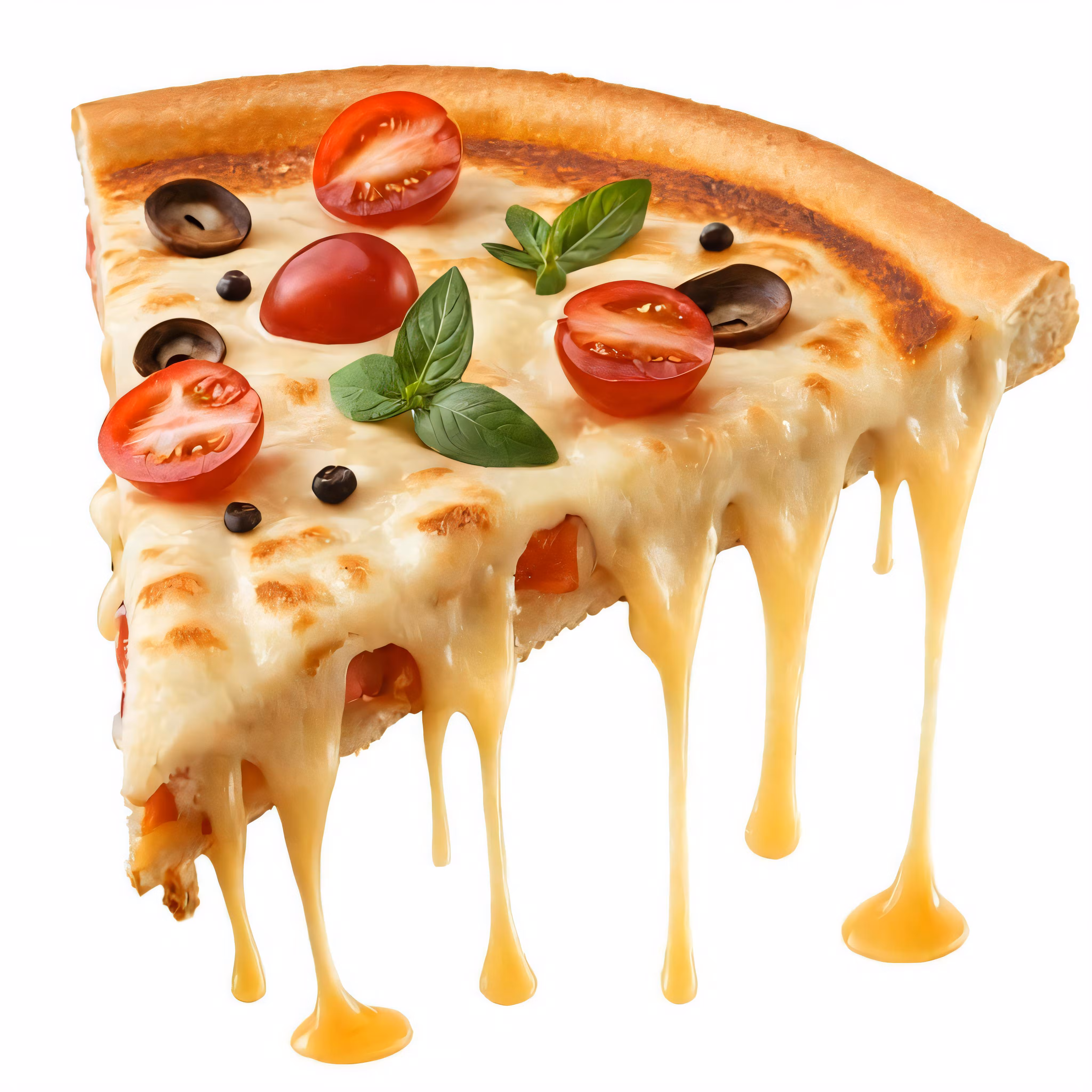 High resolution picture, free to use, a piece of cheese and tomato pizza with olives and tomatoes being carried