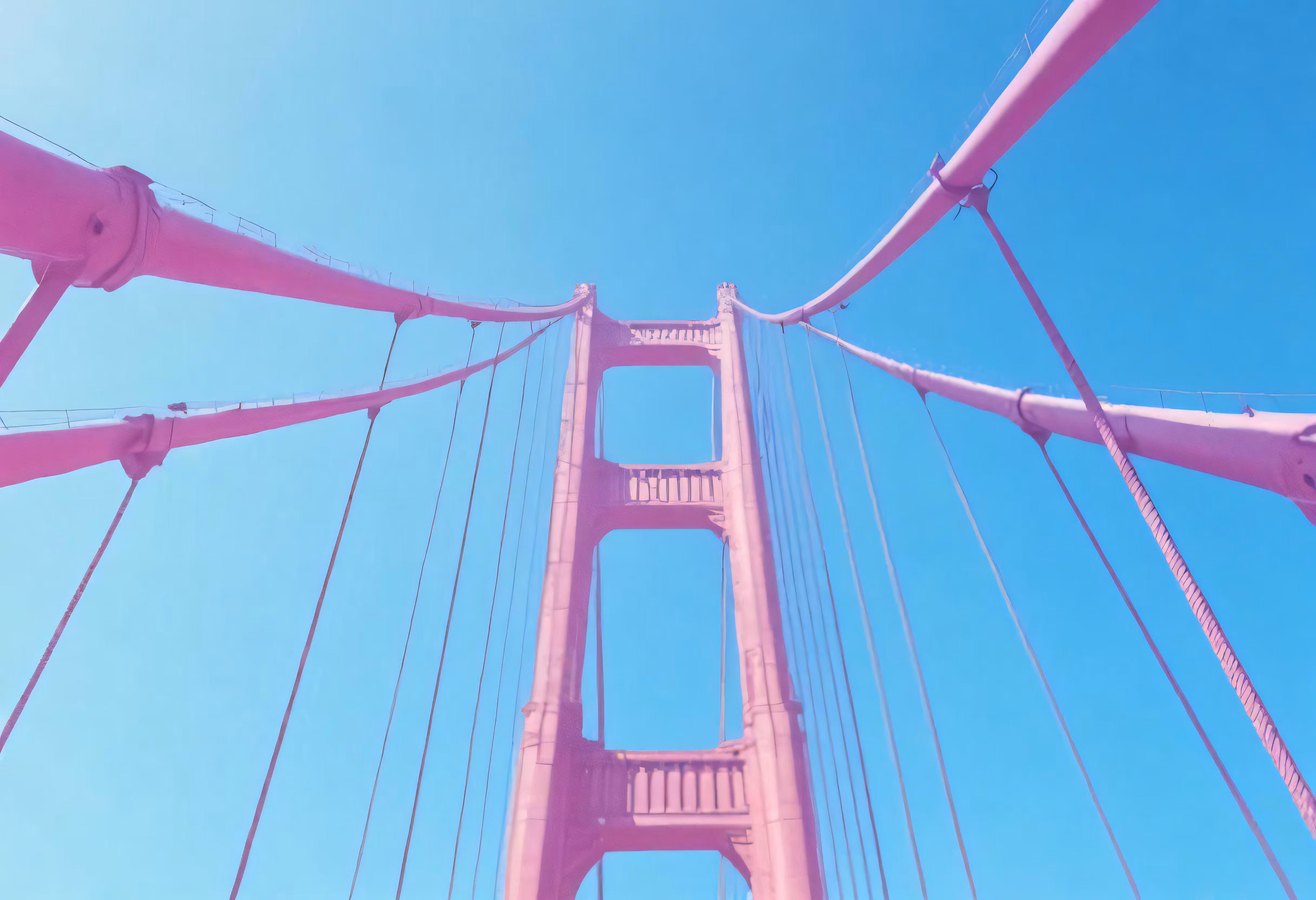 High resolution picture, free to use, a pink bridge is towering overhead under blue skies