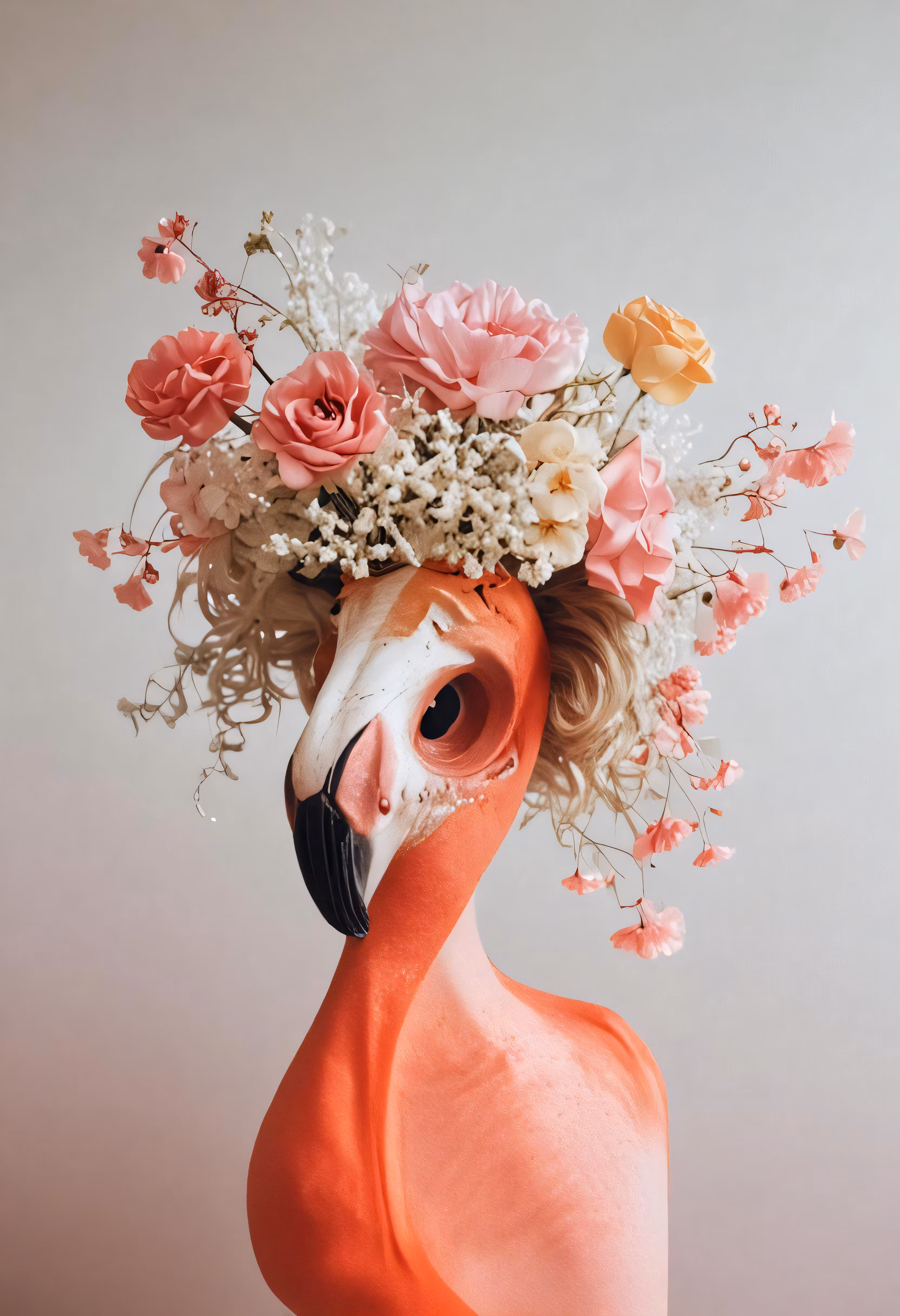 High resolution picture, free to use, a pink flamingo wearing a flower crown