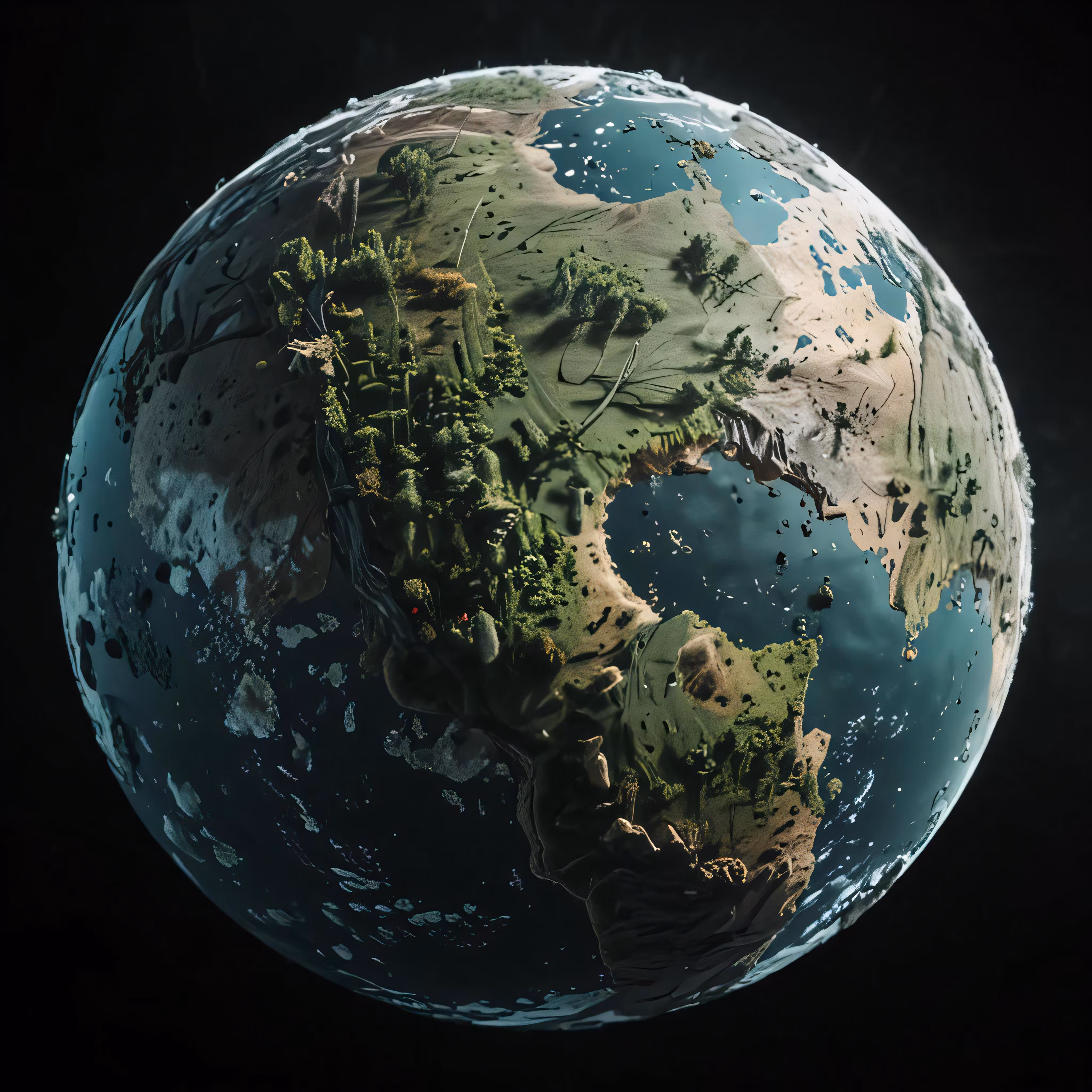 High resolution picture, free to use, a planet covered in green vegetation sits on a dark background