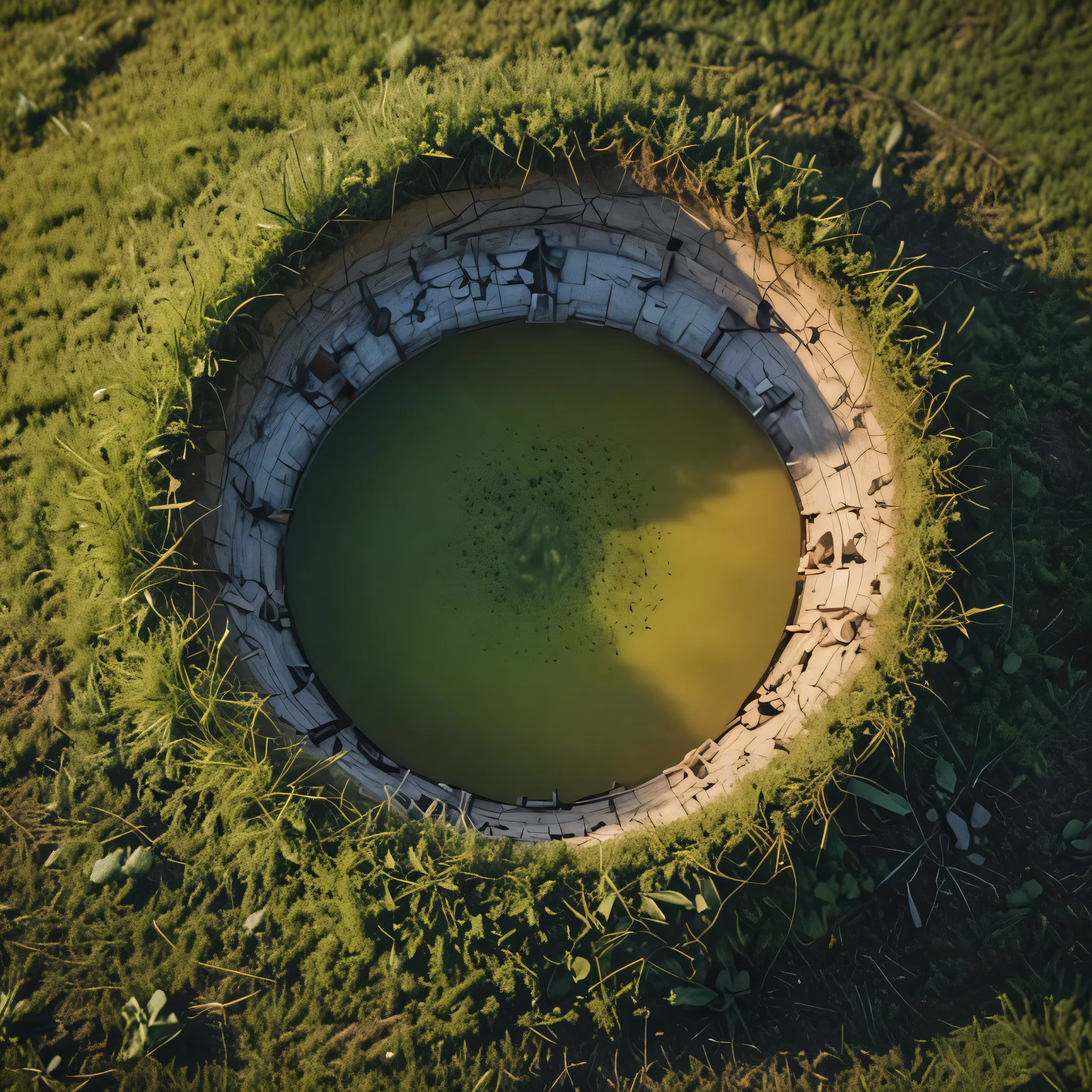 High resolution picture, free to use, a pond with a cement fence around it in the grass