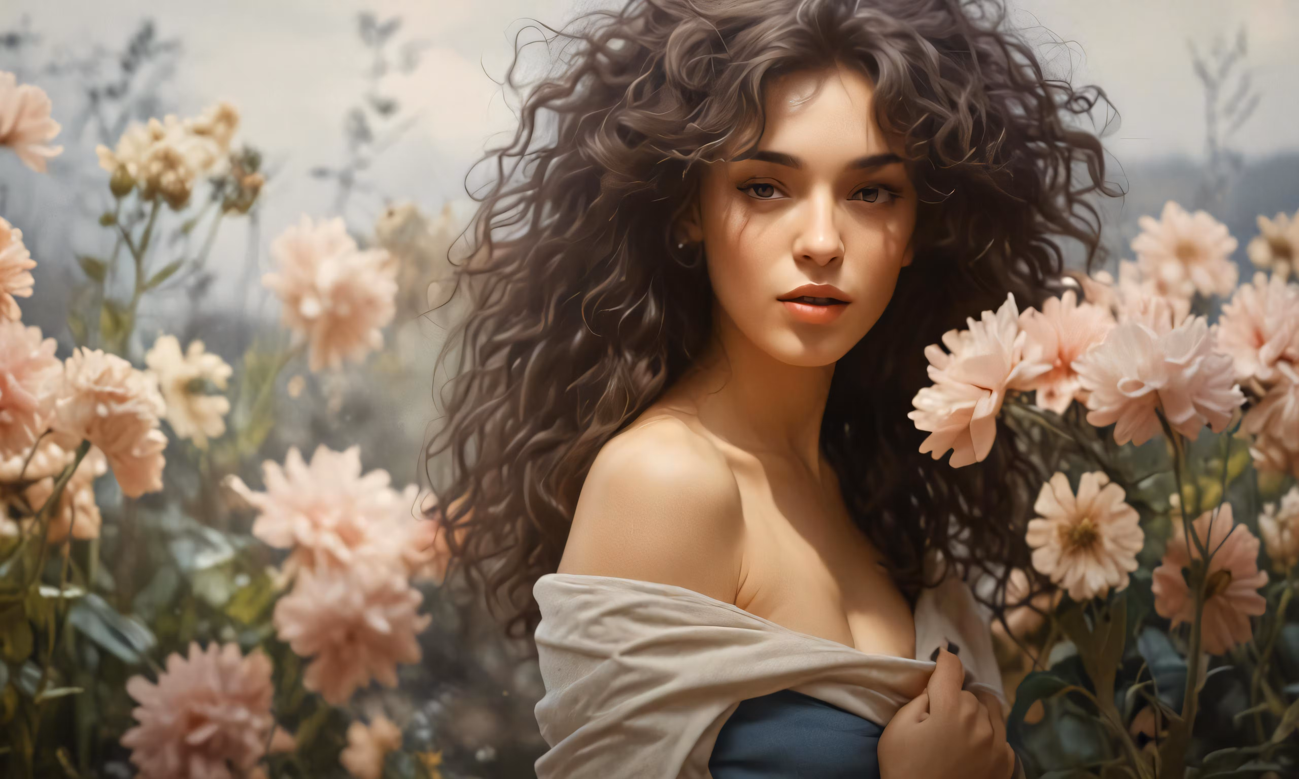 High resolution picture, free to use, a portrait of a woman in a field of flowers