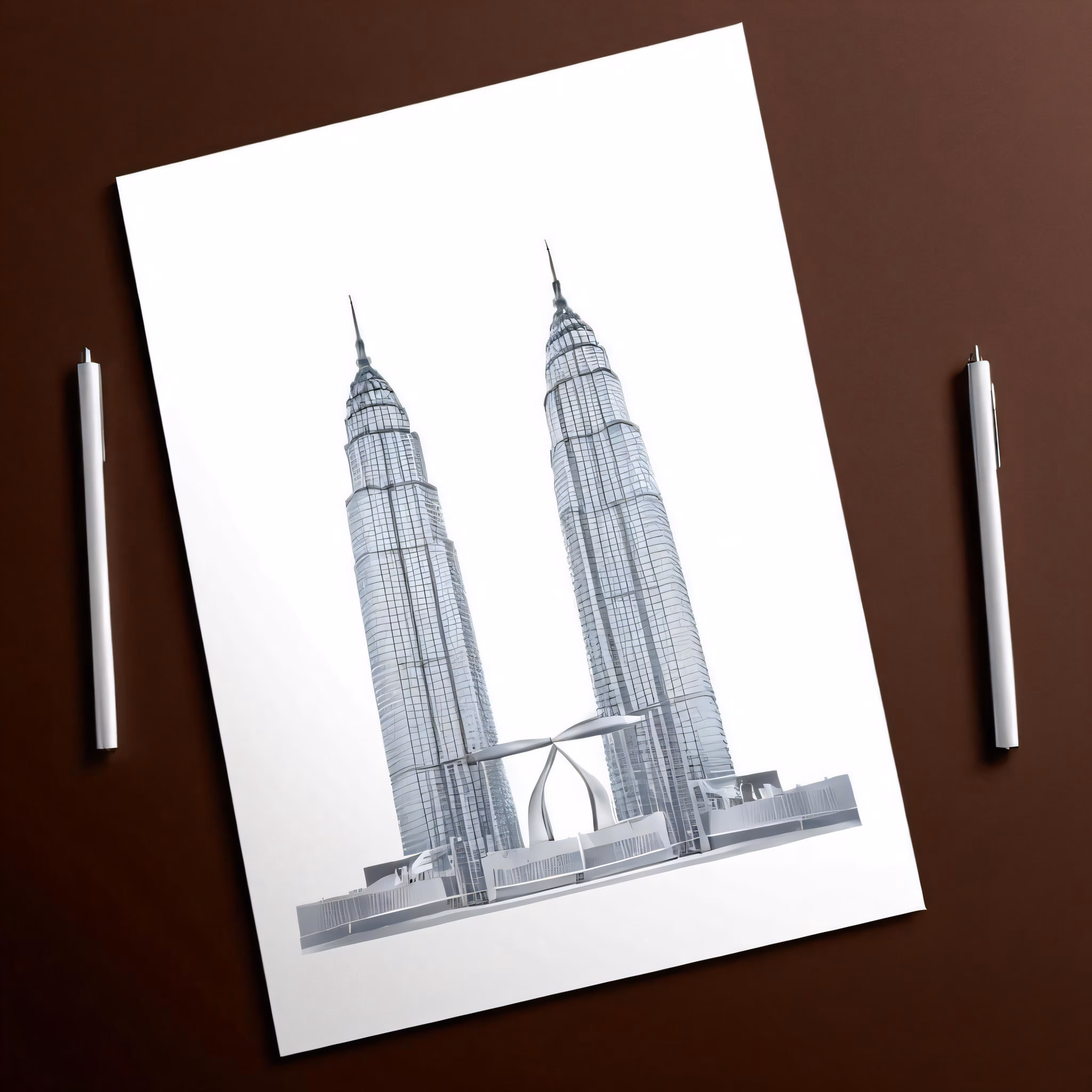 High resolution picture, free to use, a postcard on the brown table has a drawing of a large building and two white crayons
