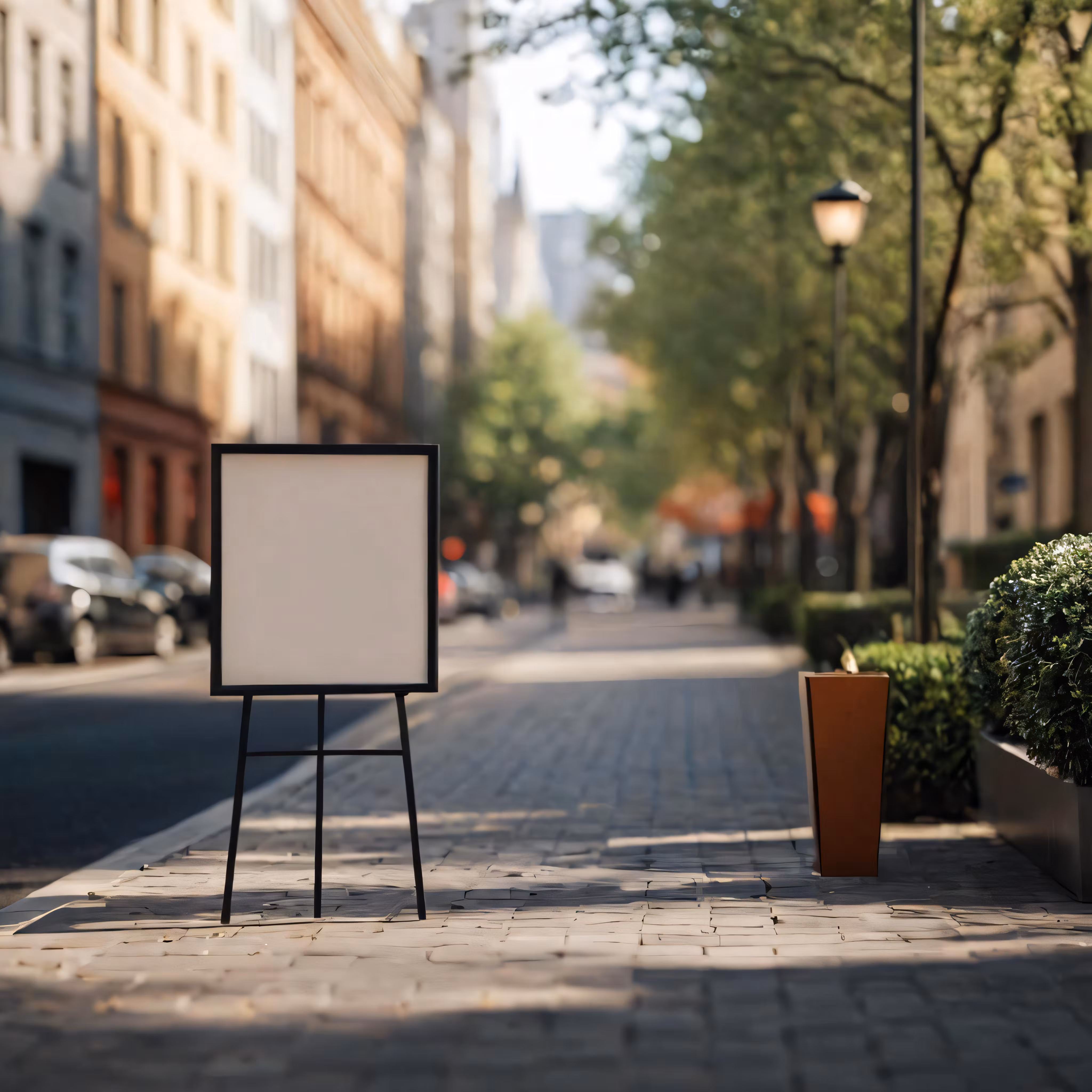 High resolution picture, free to use, a poster frame and an empty sign on a cobblestone sidewalk
