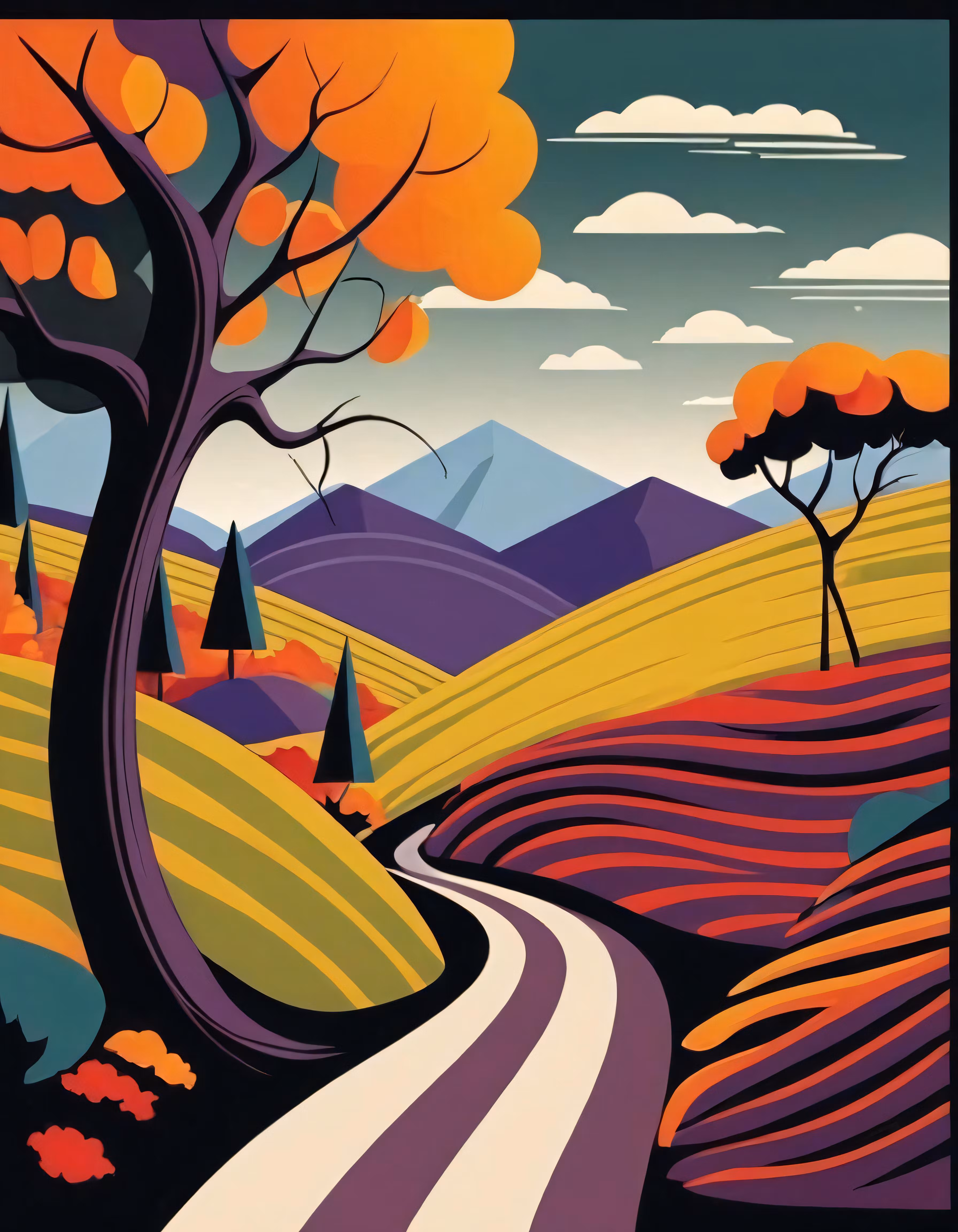 High resolution picture, free to use, a poster of an autumn road with a tree in the middle