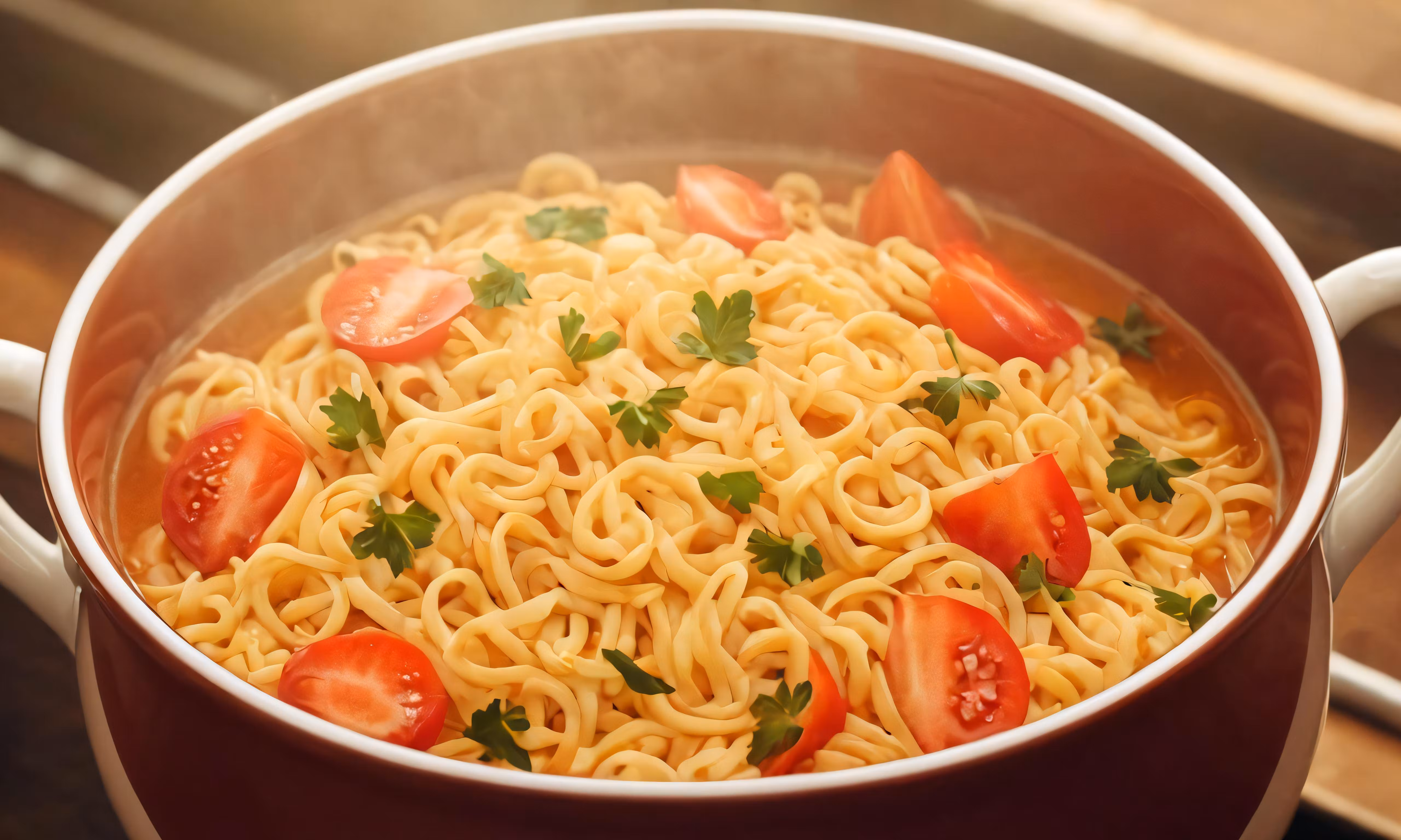 High resolution picture, free to use, a pot filled with noodles and tomatoes on top of a table