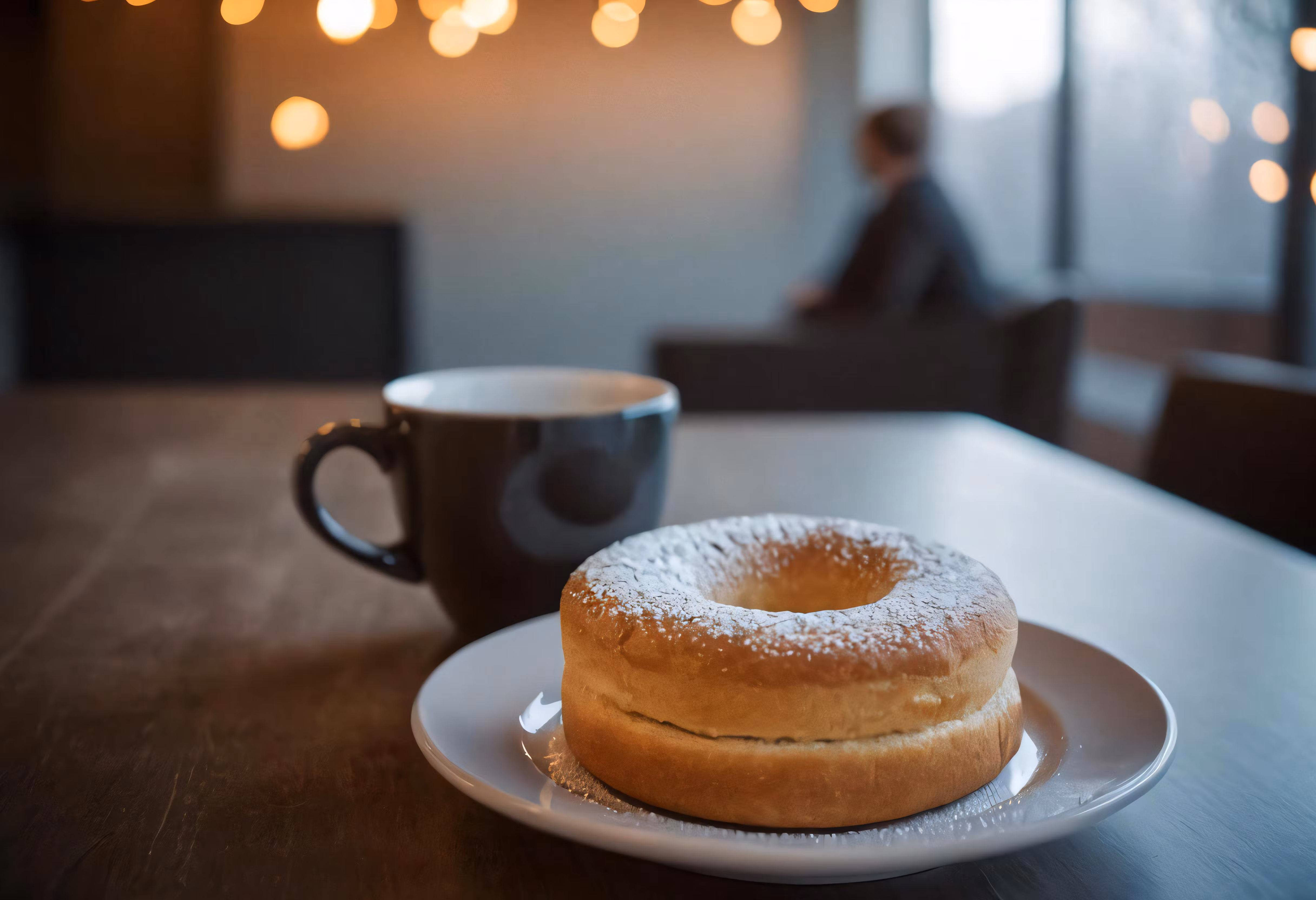 High resolution picture, free to use, a powdered sugar doughnut and coffee cup sit on the dining room table