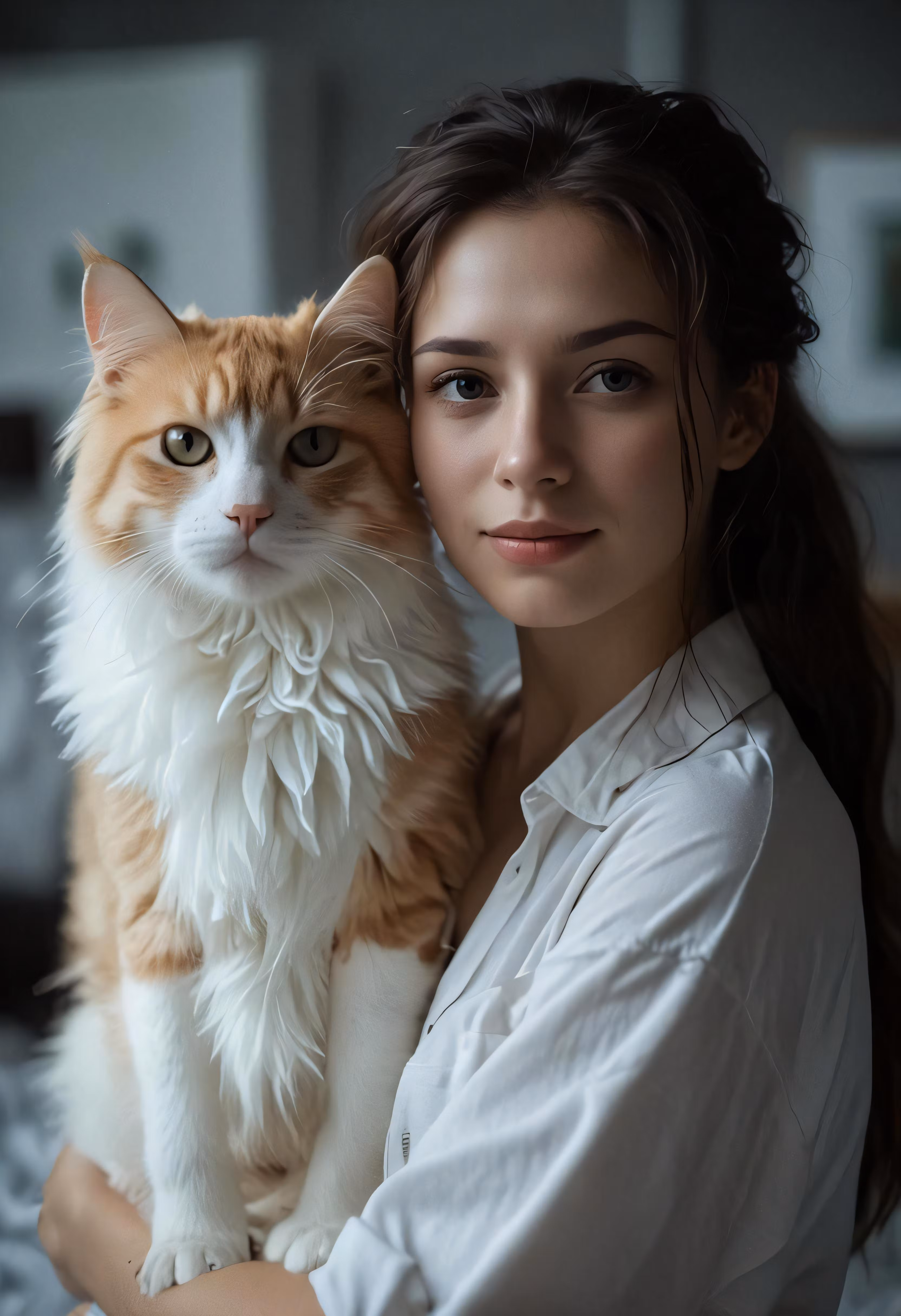 High resolution picture, free to use, a pretty young woman holding a cat on top of a bed