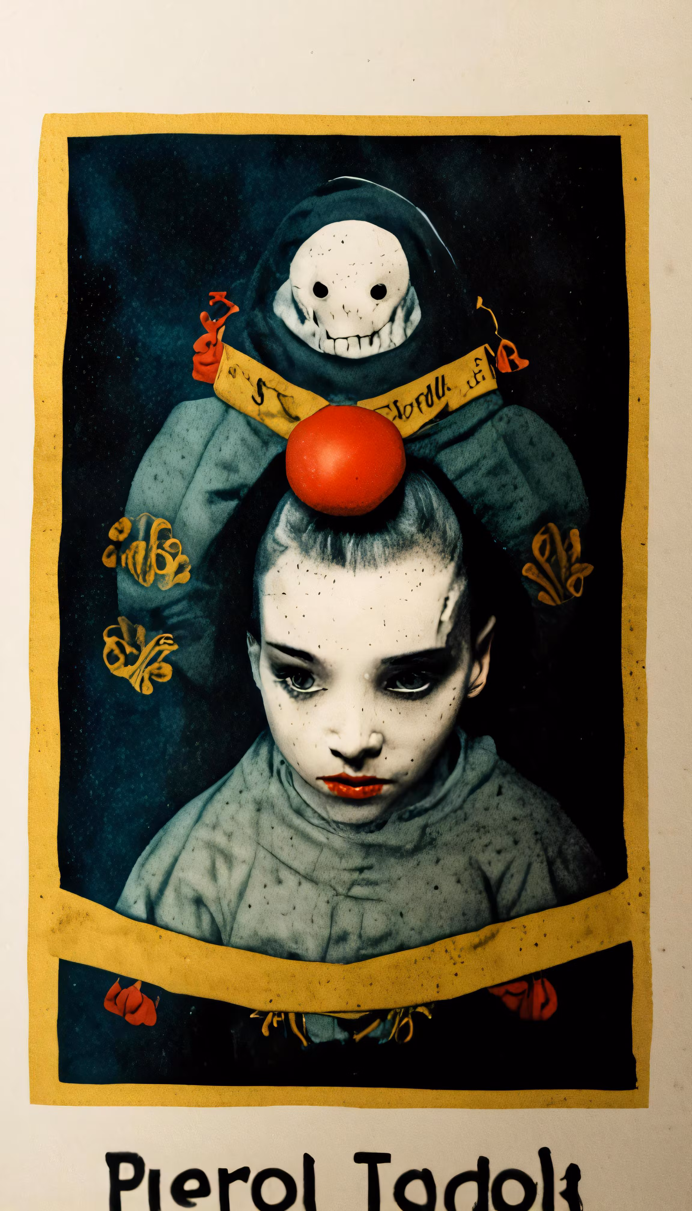 High resolution picture, free to use, a print of two clowns facing each other with a skull on top