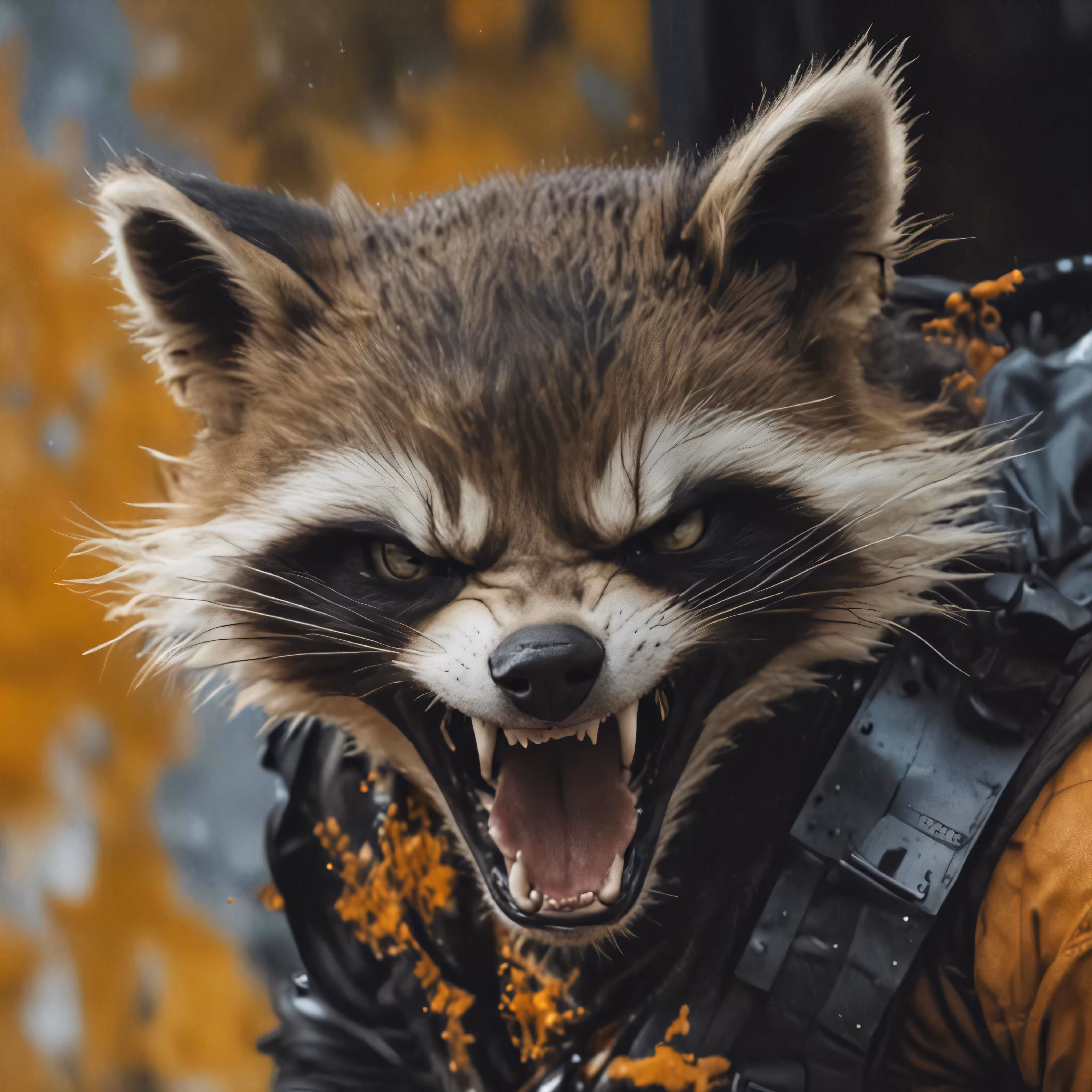 High resolution picture, free to use, a raccoon wearing a leather outfit with a hood on