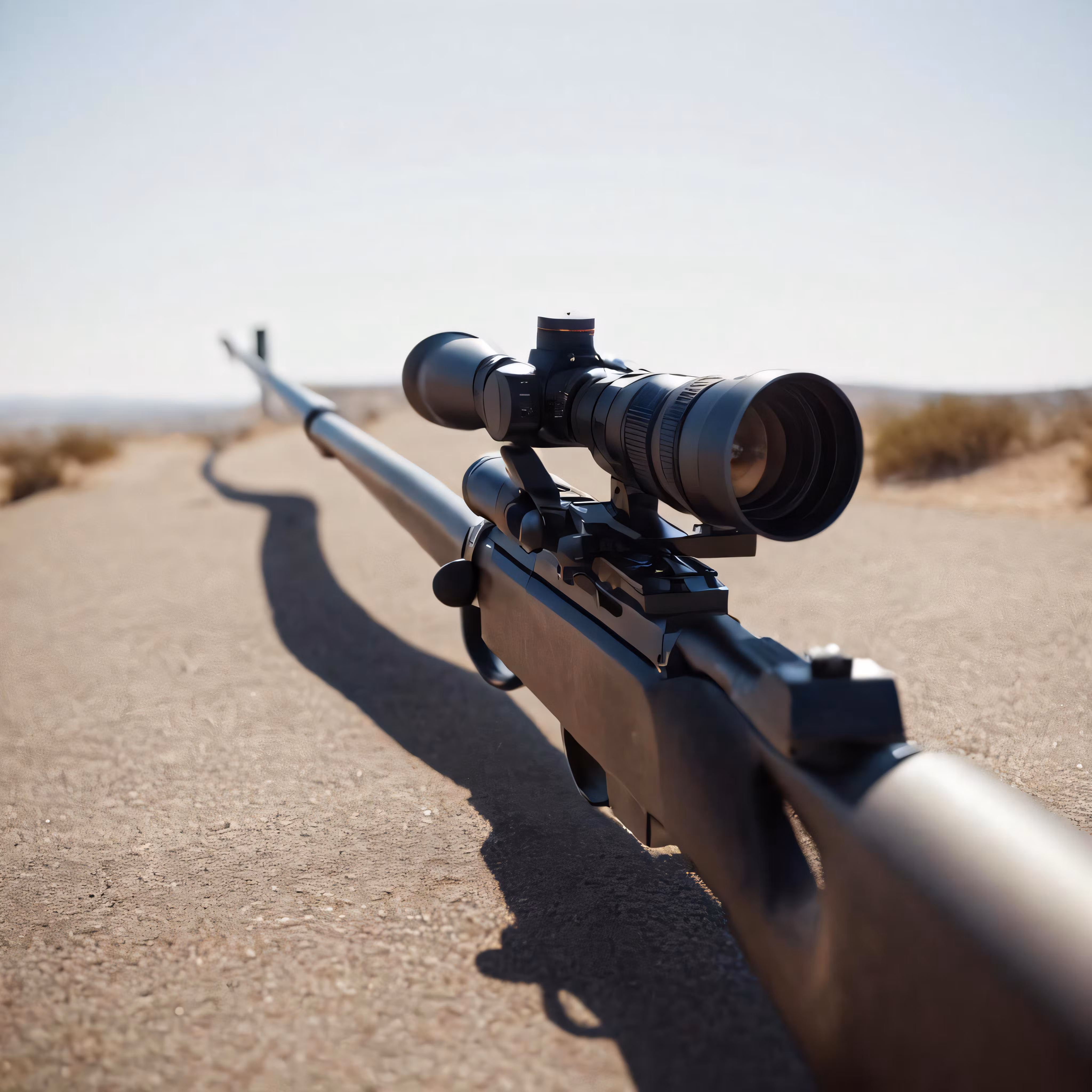 High resolution picture, free to use, a rifle with scope and tripod is parked in a desert