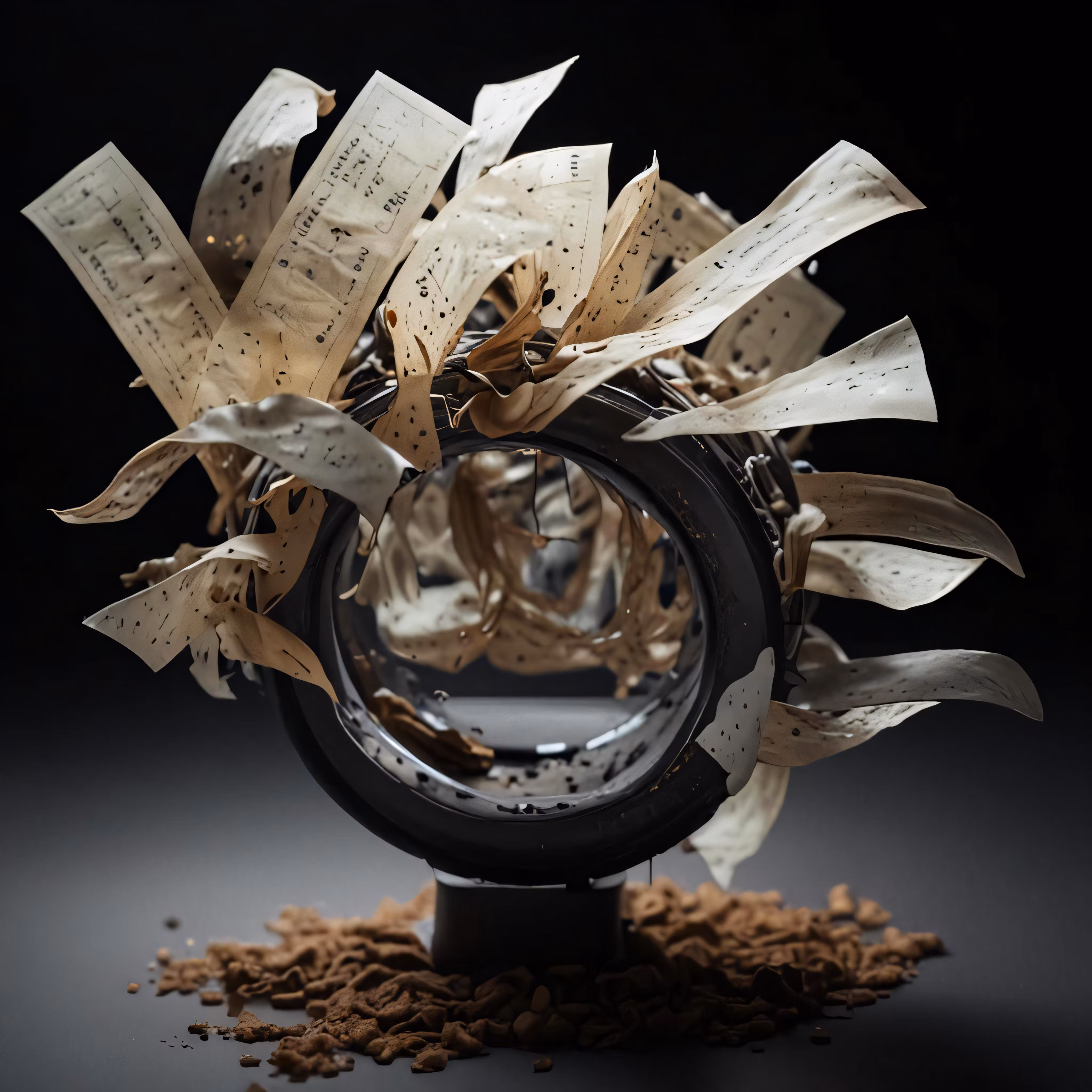 High resolution picture, free to use, a ring is arranged with old sheet music on a black background