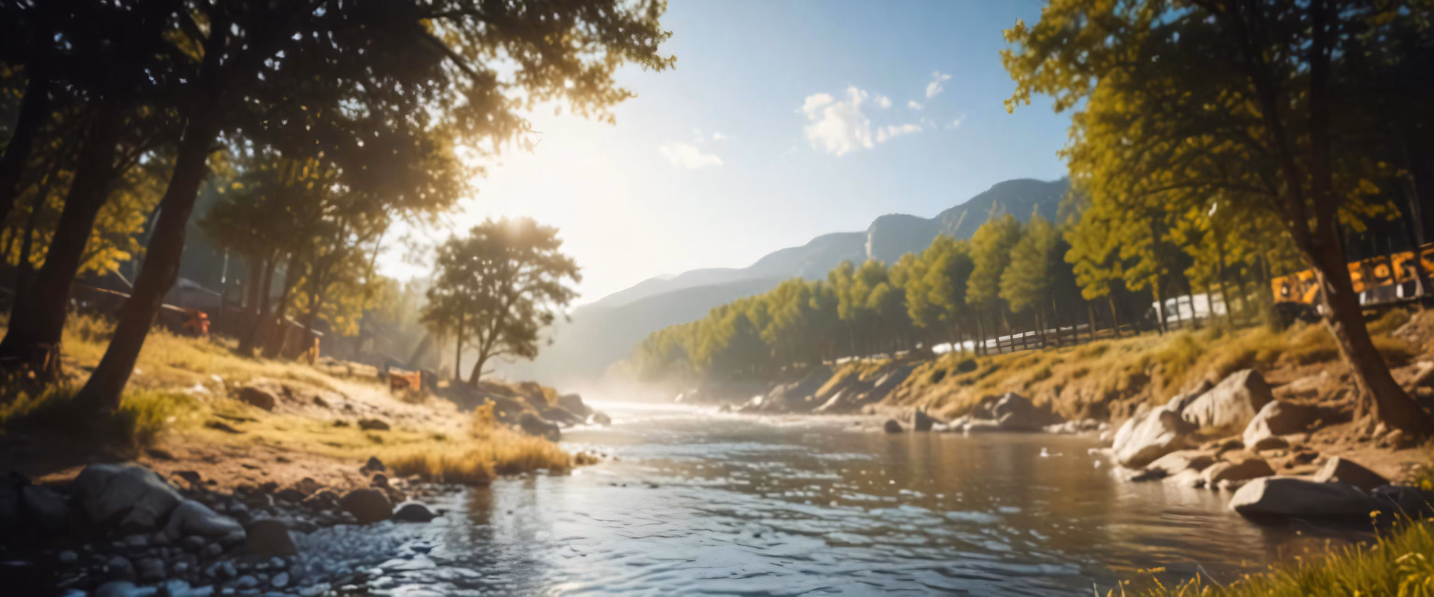 High resolution picture, free to use, a river flows down a bank by a wooded area