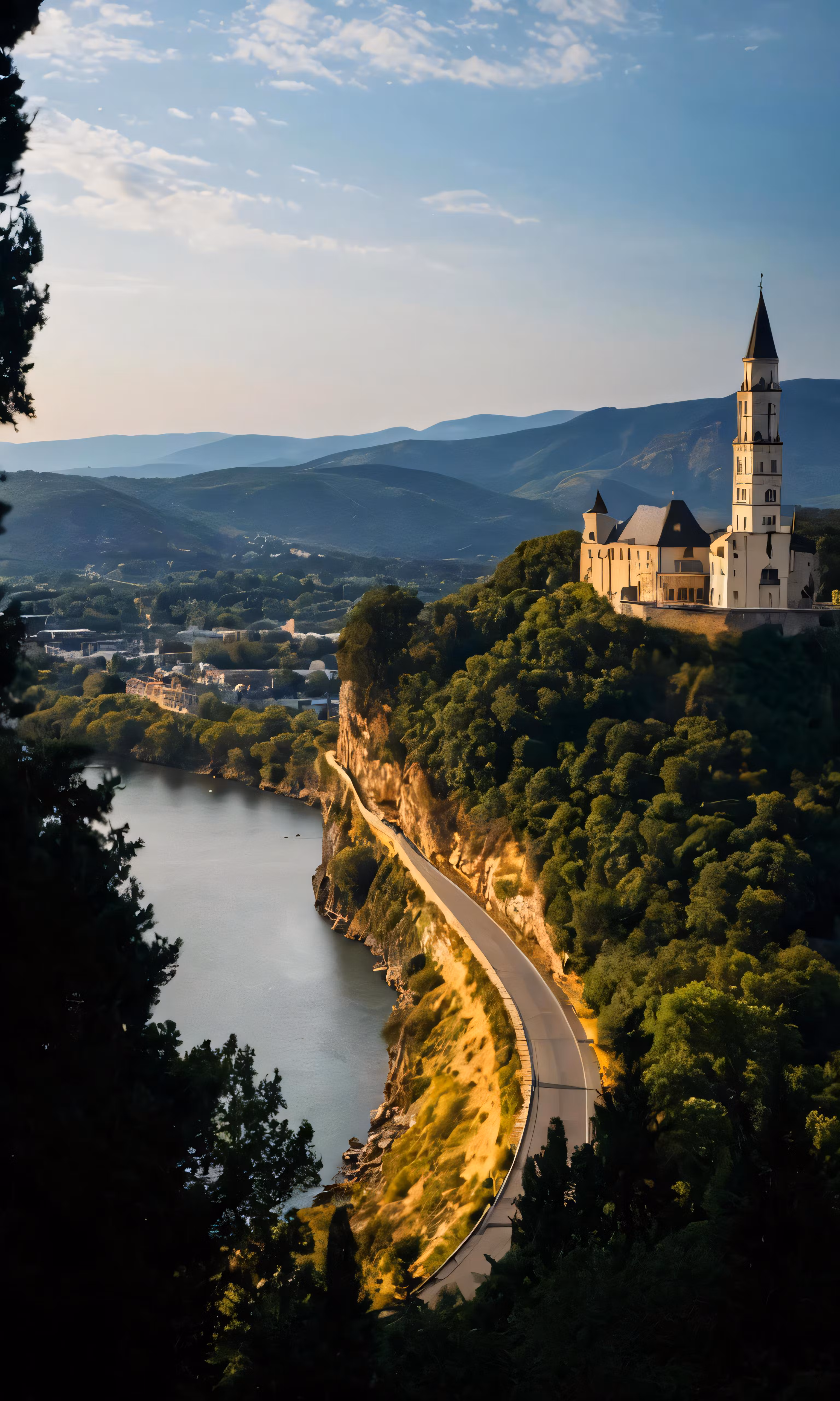 High resolution picture, free to use, a road on the side of the water with a castle on top