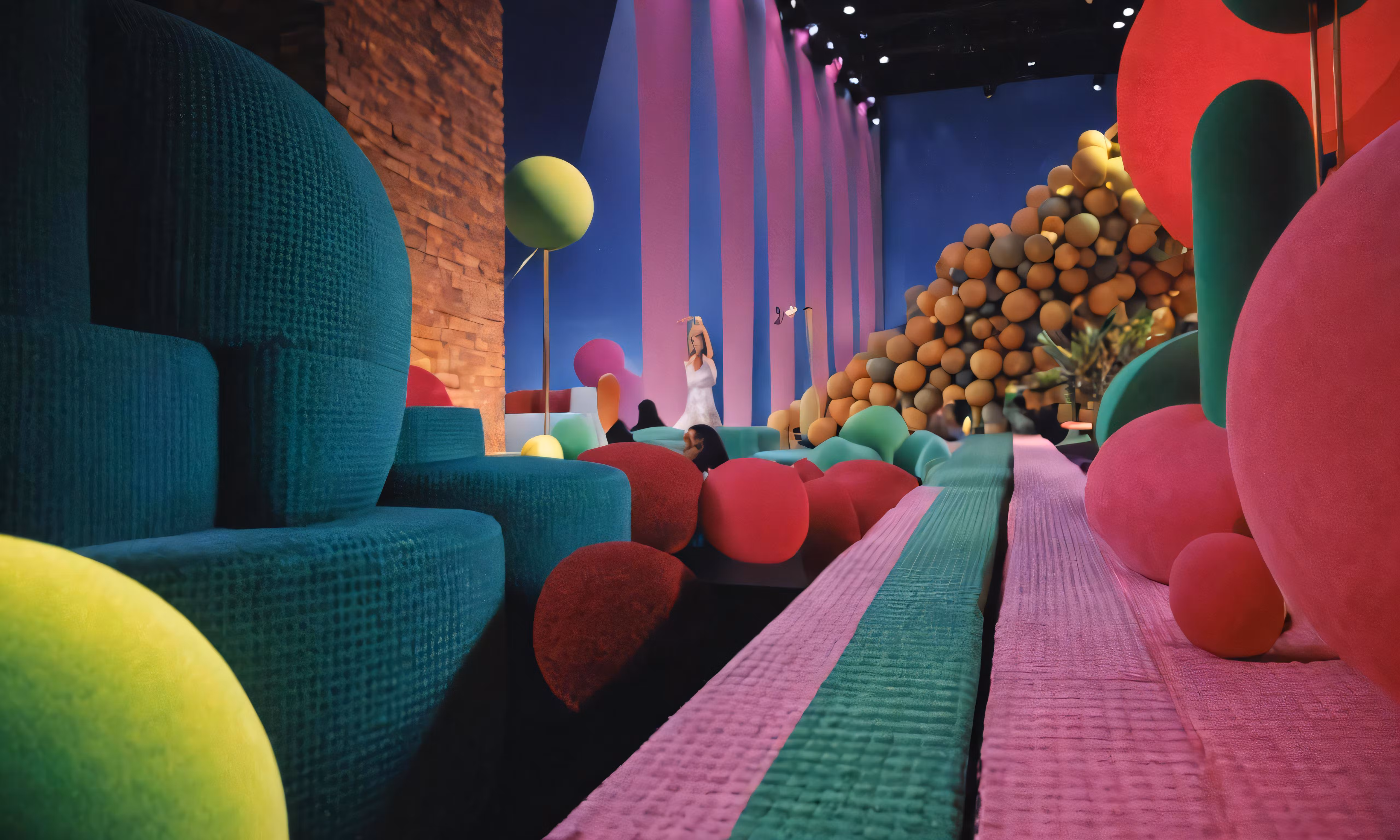 High resolution picture, free to use, a room with brightly colored furniture on one floor and colorful walls on the other