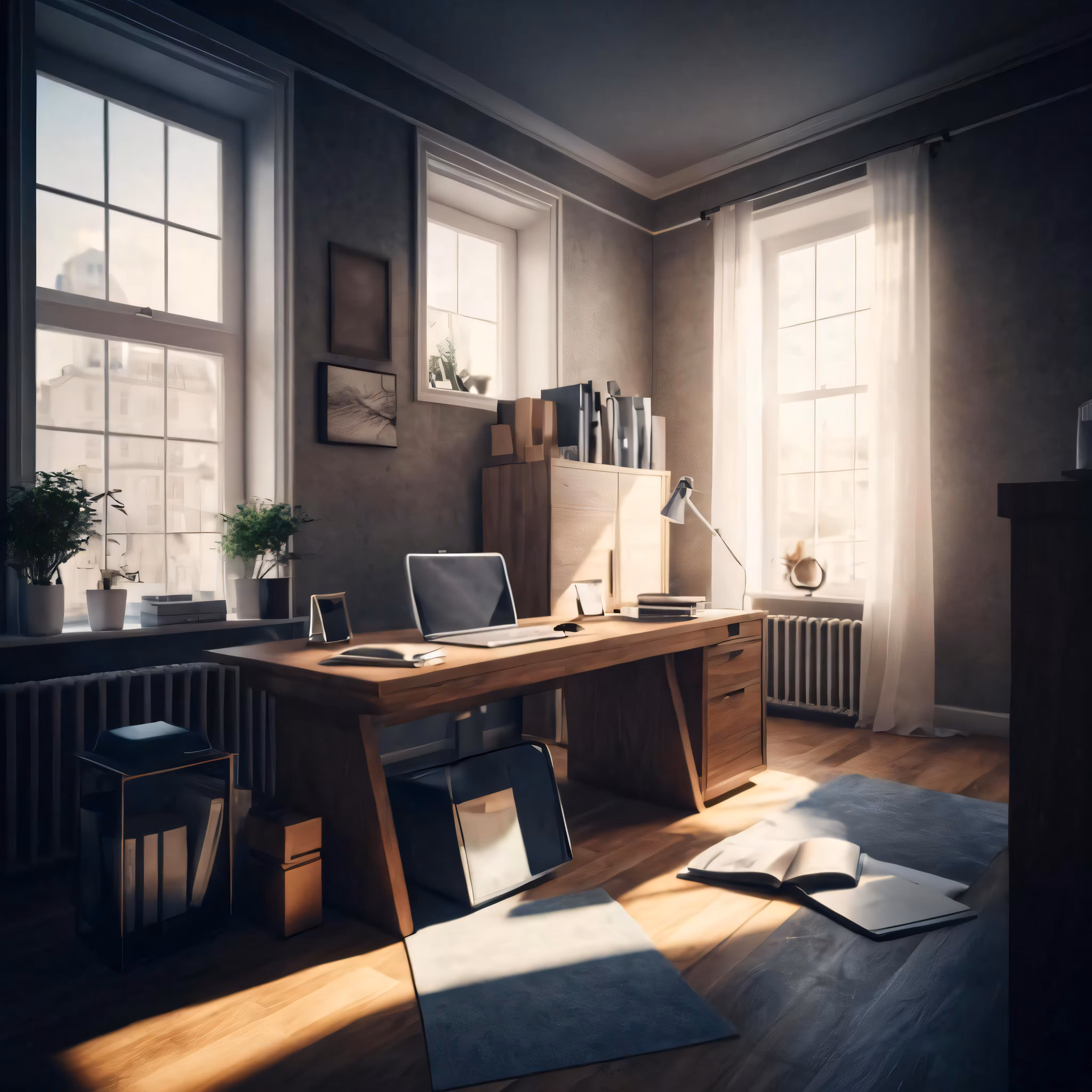 High resolution picture, free to use, a room with hard wood floors, a wooden desk and several windows with sunny sunlight