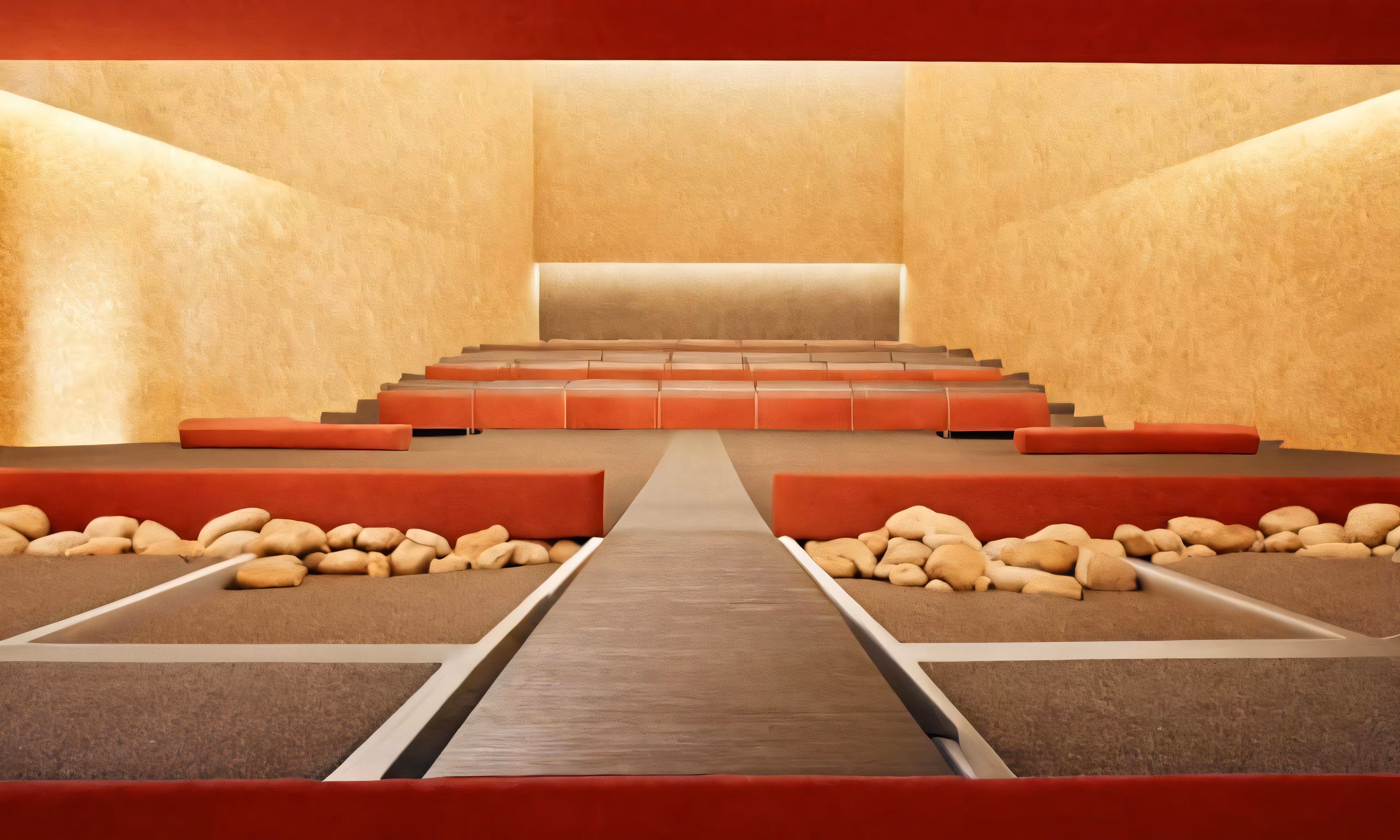 High resolution picture, free to use, a room with red benches and white lines and rocks
