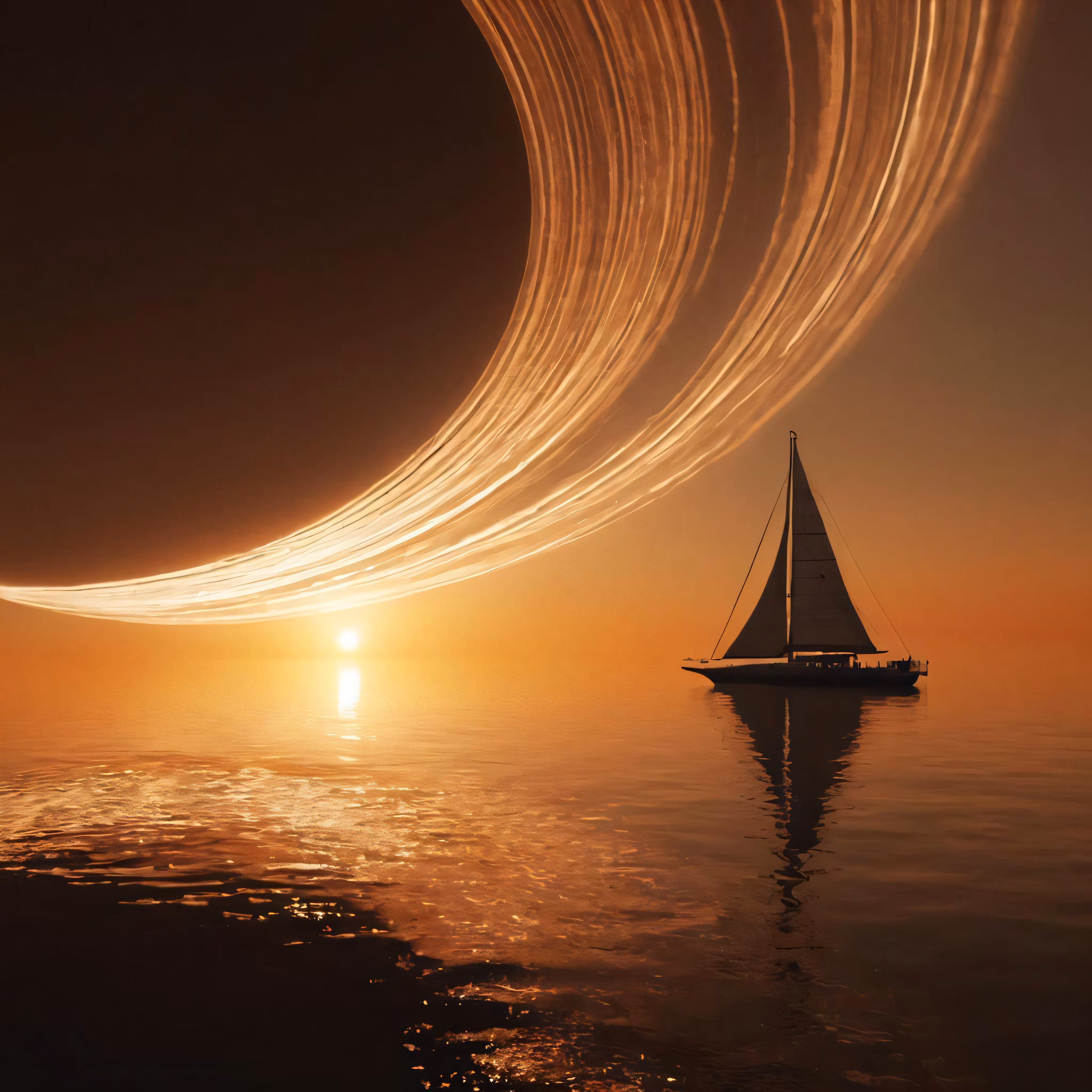 High resolution picture, free to use, a sail boat on a body of water near a group of rings