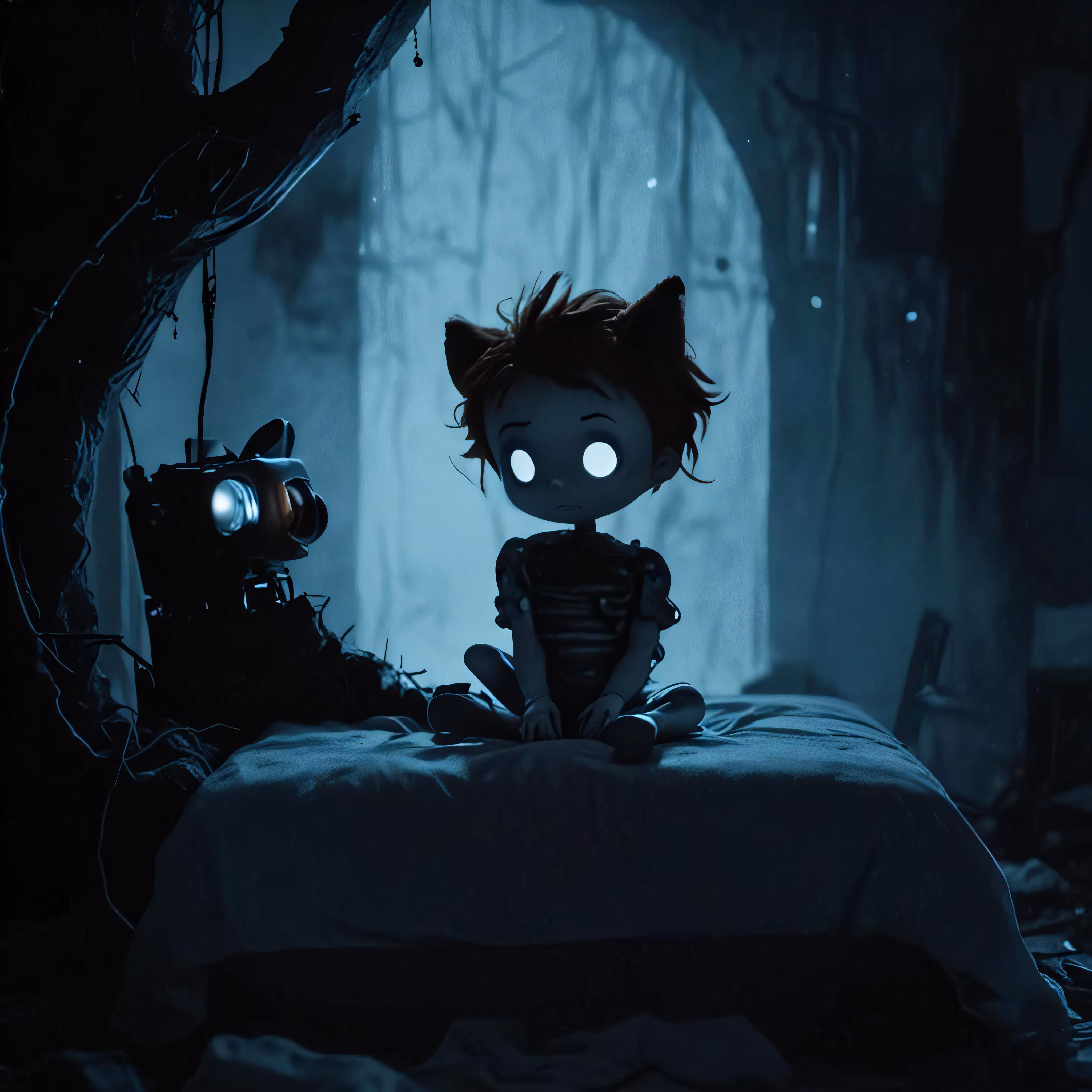 High resolution picture, free to use, a scary looking kid with big eyes is sitting on a bed