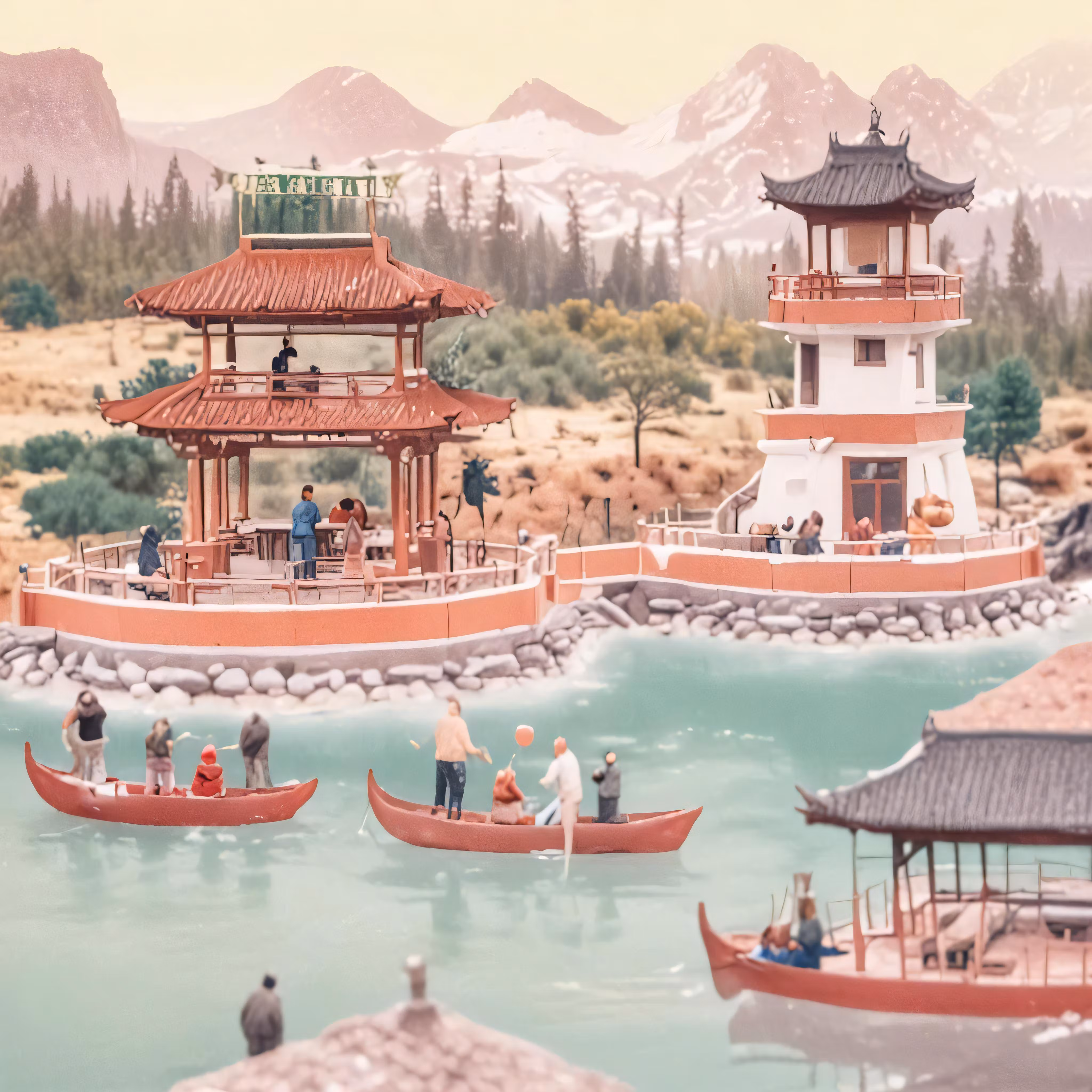 High resolution picture, free to use, a scenic painting shows boats moving along a waterway, with an oriental building to the side and mountains in the background