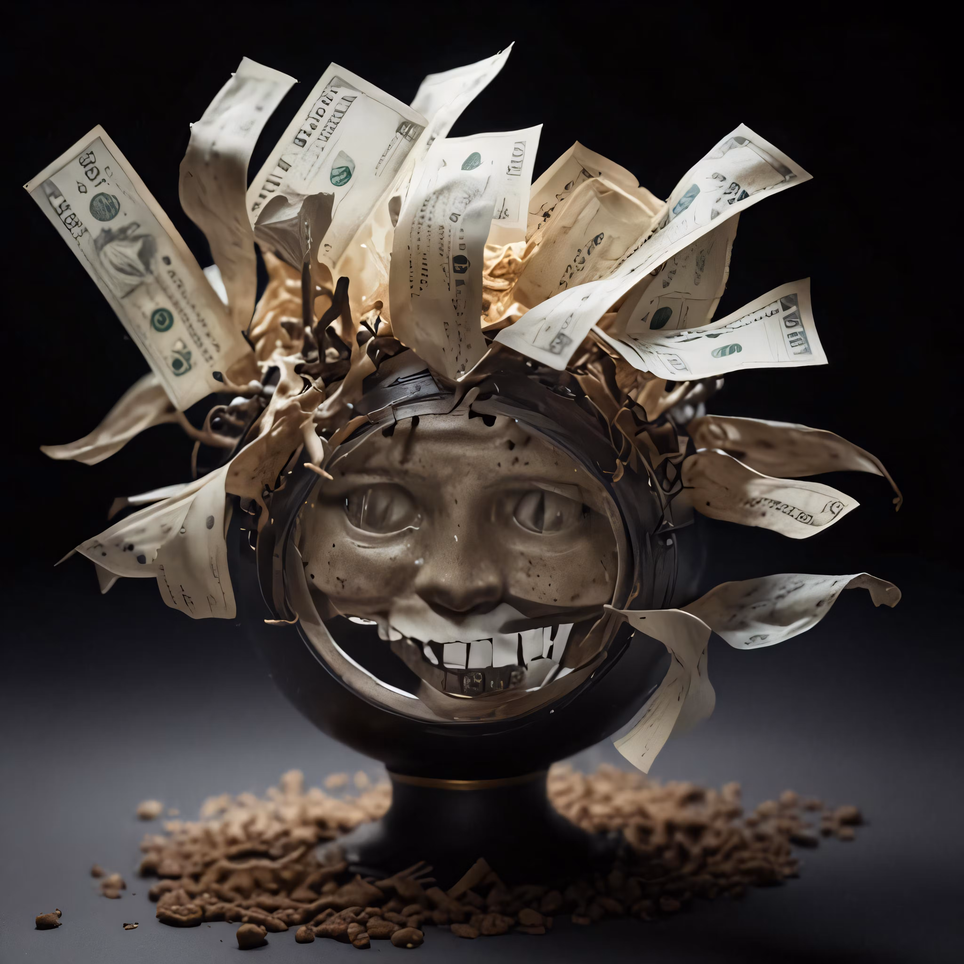 High resolution picture, free to use, a sculpture of a smiley face made out of dollar bills