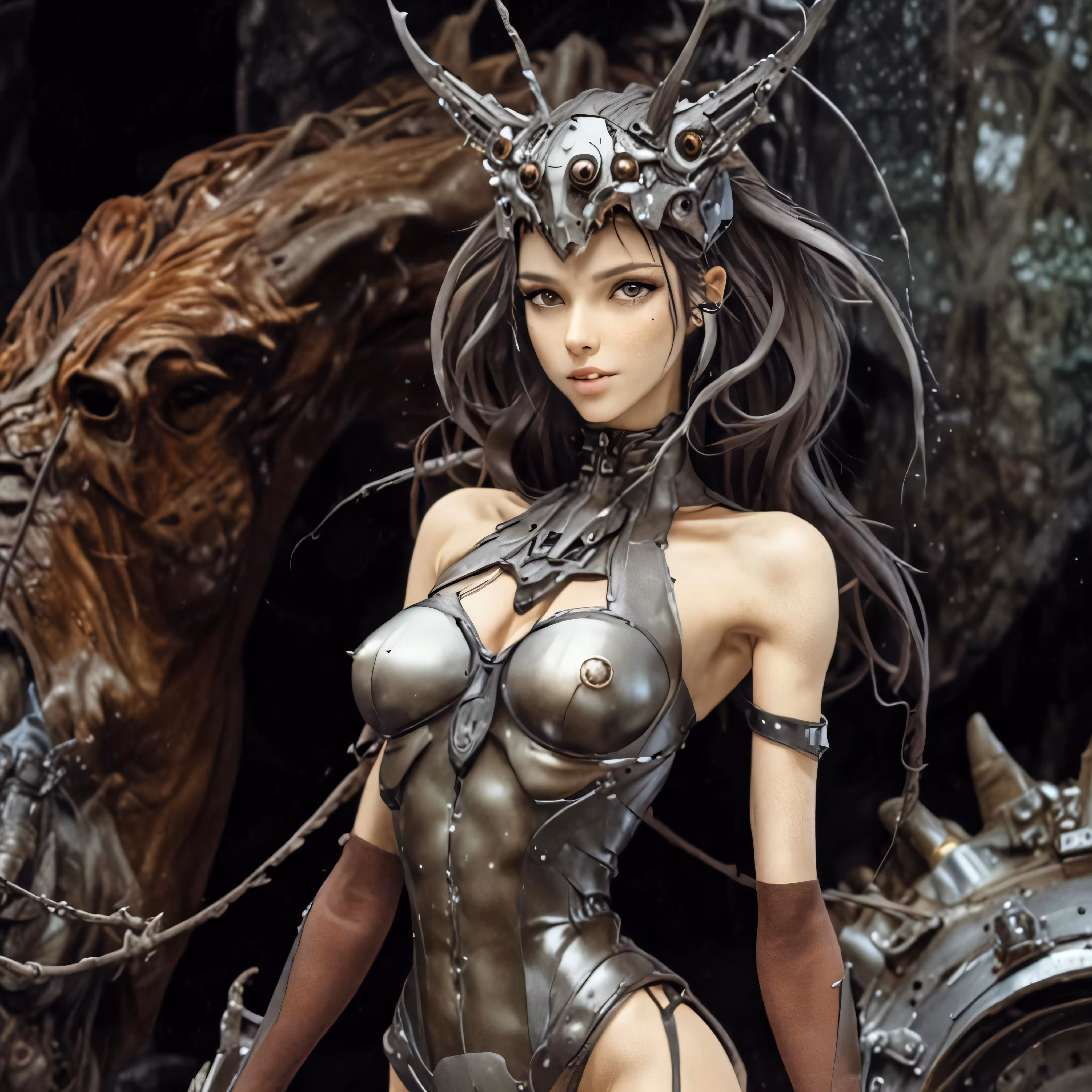 High resolution picture, free to use, a sexy alien woman in armor next to a giant robot