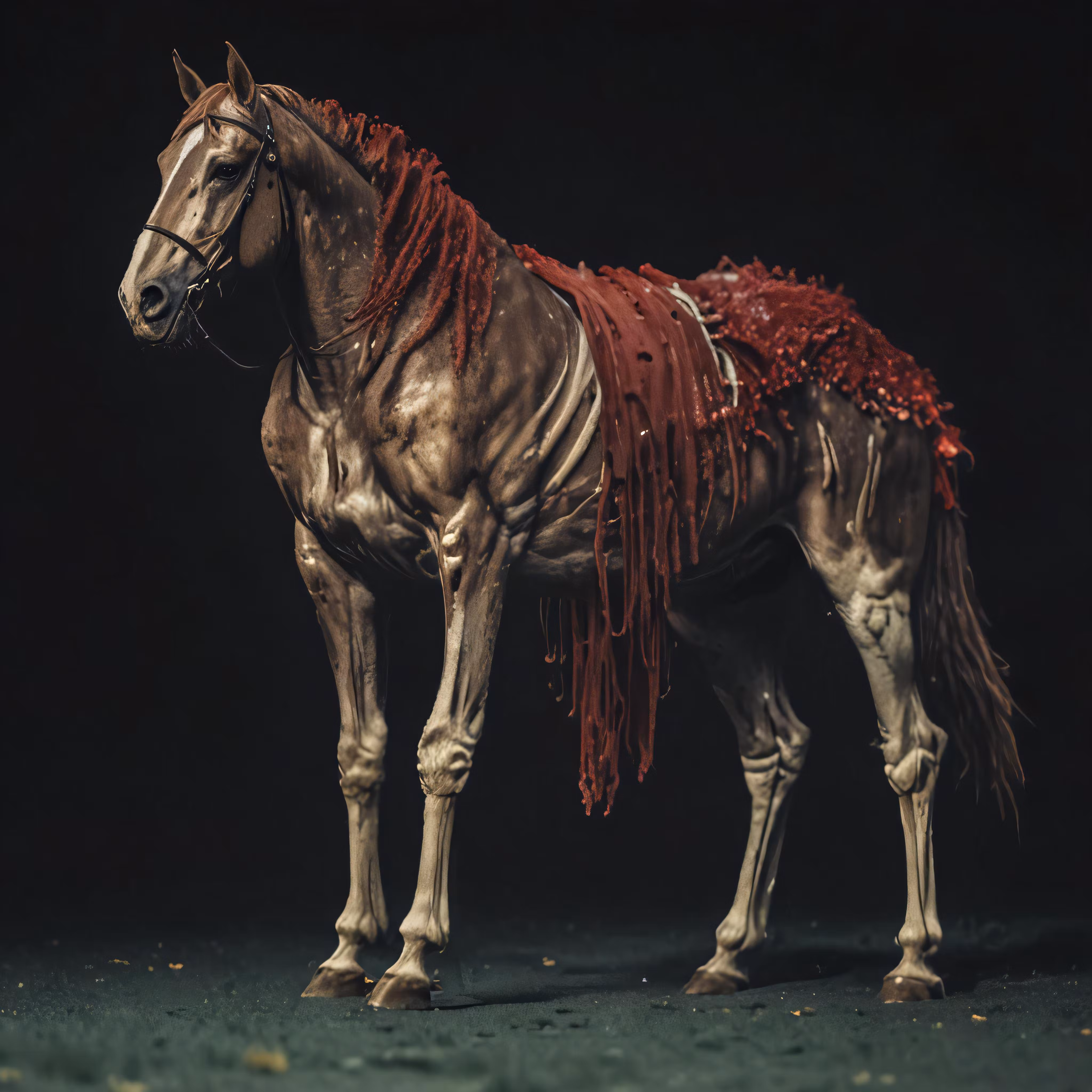 High resolution picture, free to use, a skeleton horse with a fringe in the dark