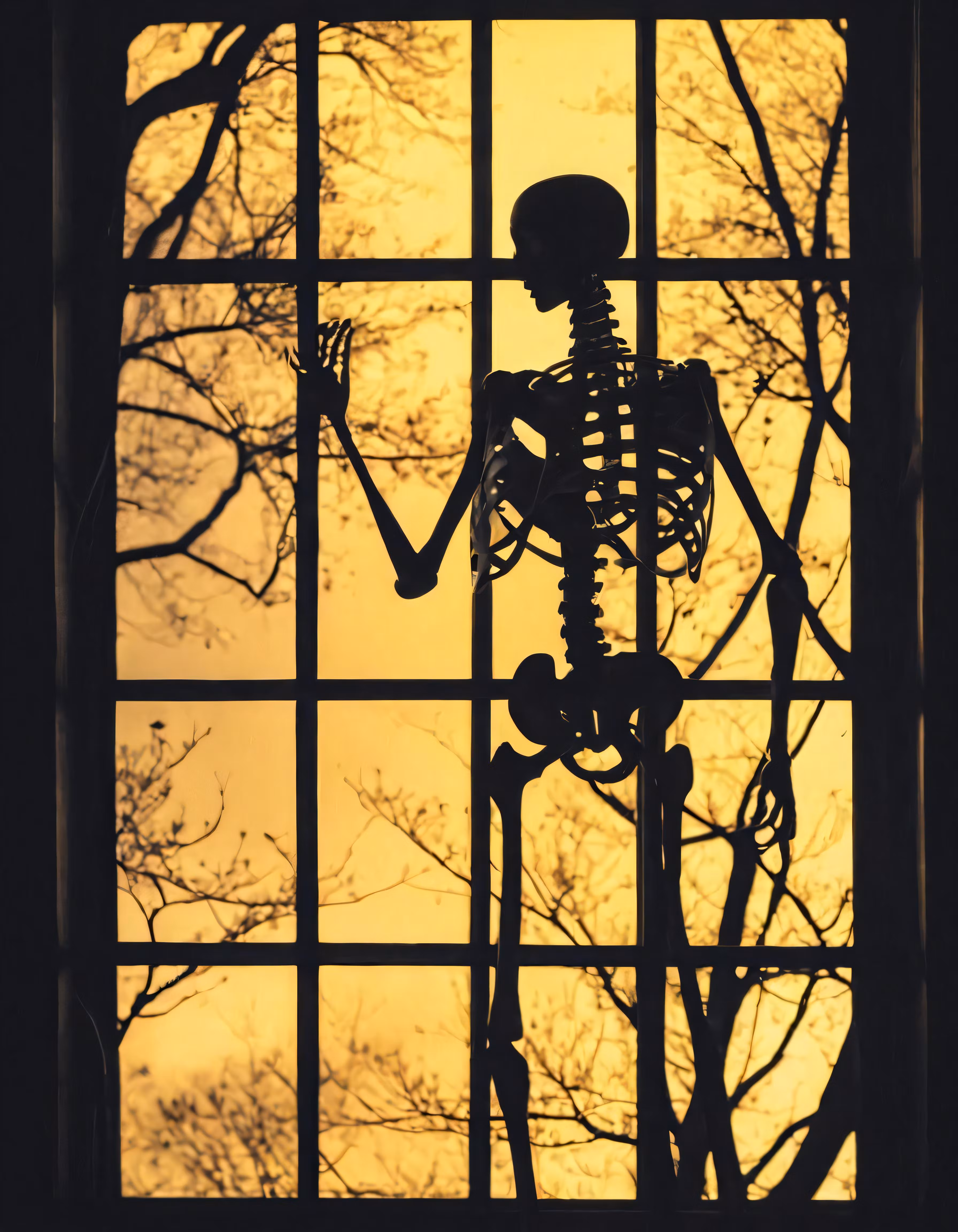 High resolution picture, free to use, a skeleton is outside through the window of a house