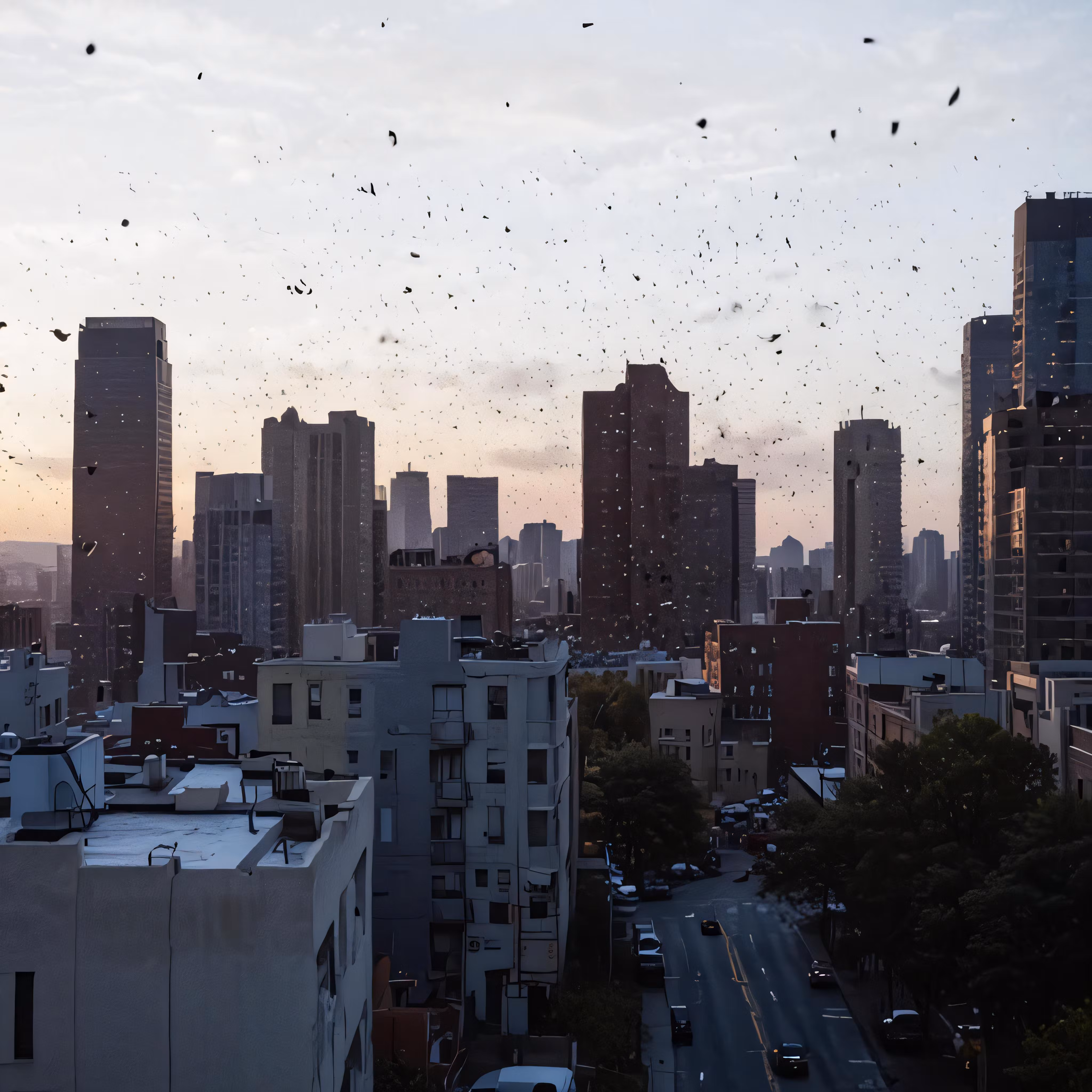 High resolution picture, free to use, a sky view of a city with many birds in the air
